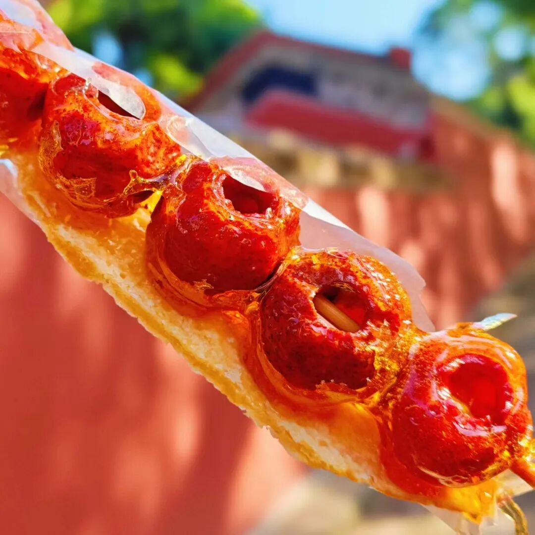 奶皮子糖葫芦是今年秋冬小吃界的“顶流”,它将北方传统的冰糖葫芦与内蒙古特色奶制品——奶皮子结合,冰糖壳清脆甜蜜,搭配奶皮子的醇厚香浓,口感新颖独特,成为年轻人排队抢购的新晋网红。