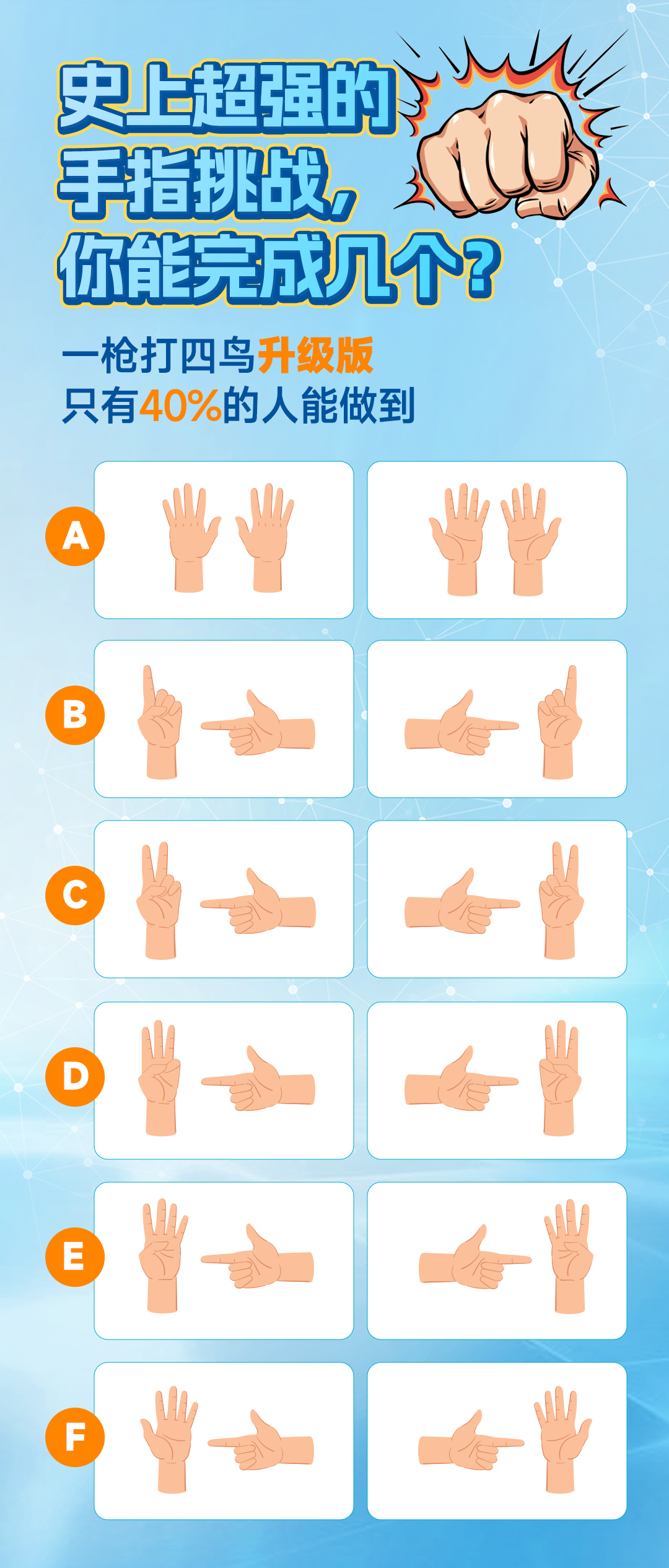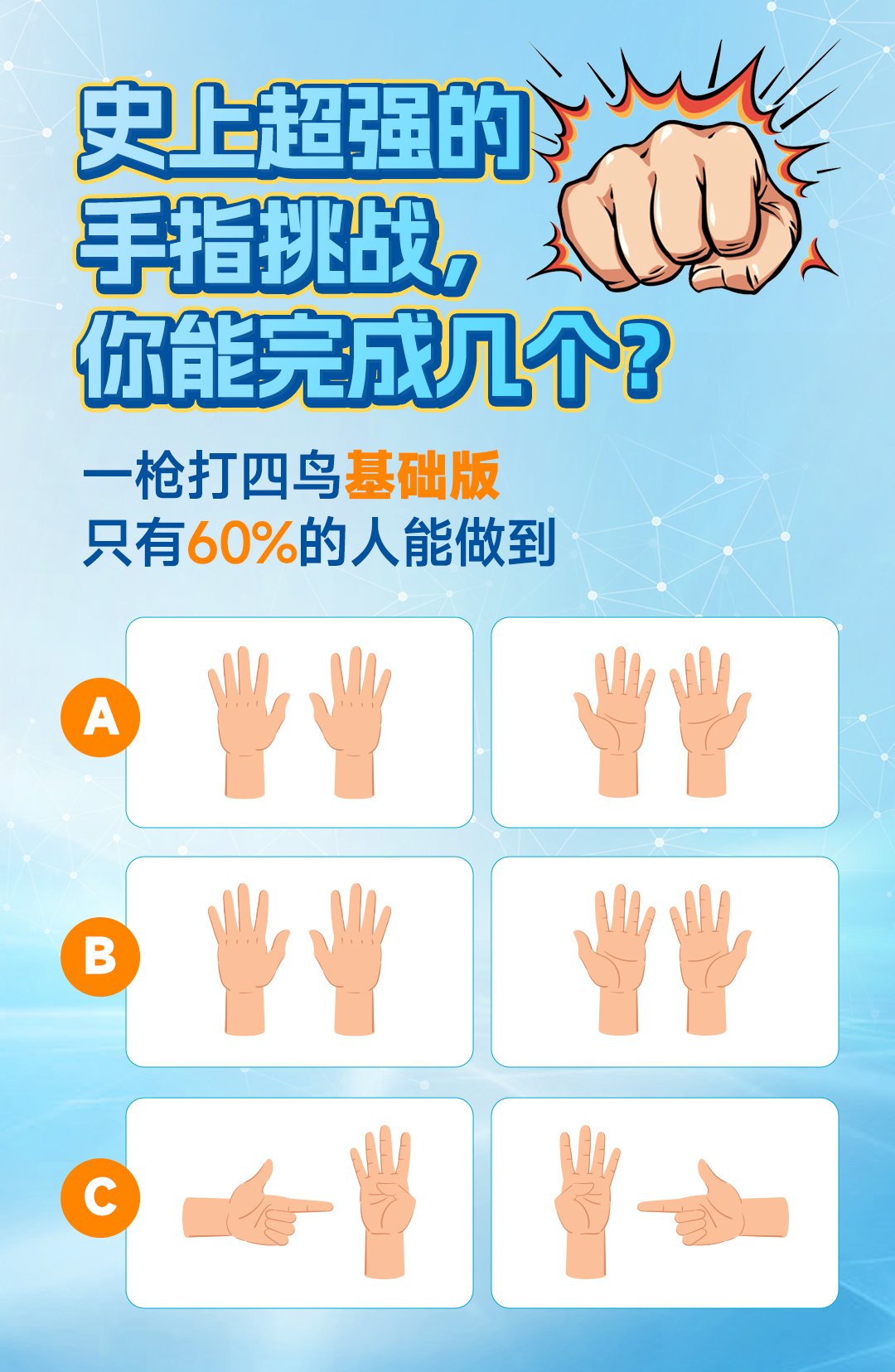 来试试这个手指灵活度挑战,根据图示左右手交替进行数字比划,看看你能做得到哪一个。