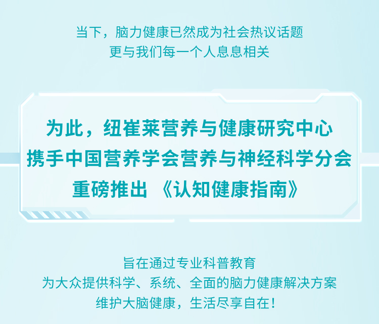 为此,纽崔莱营养与健康研究中心携手中国营养学会营养与神经科学分会重磅推出《认知健康指南》