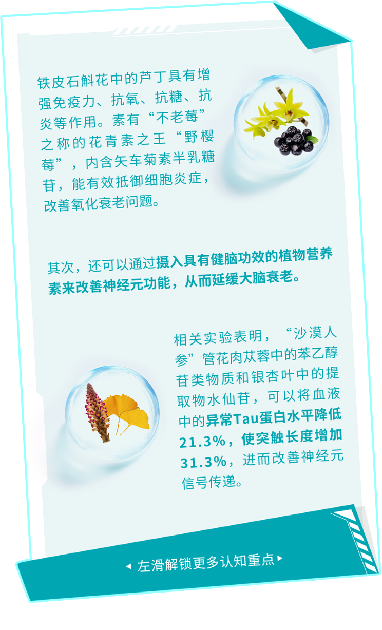 其次,还可以通过摄入具有健脑功效的植物营养素来改善神经元功能,从而延缓大脑衰老。