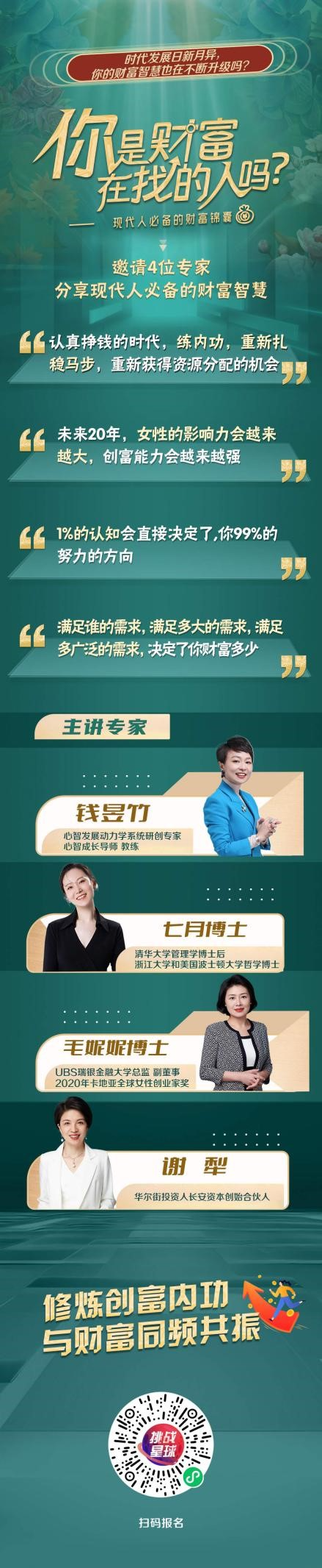 所以今天,我们为女性量身定制了一套“财富破局方案”:线下沙龙《找到财富甜蜜点》+线上课《你是财富在找的人吗》。