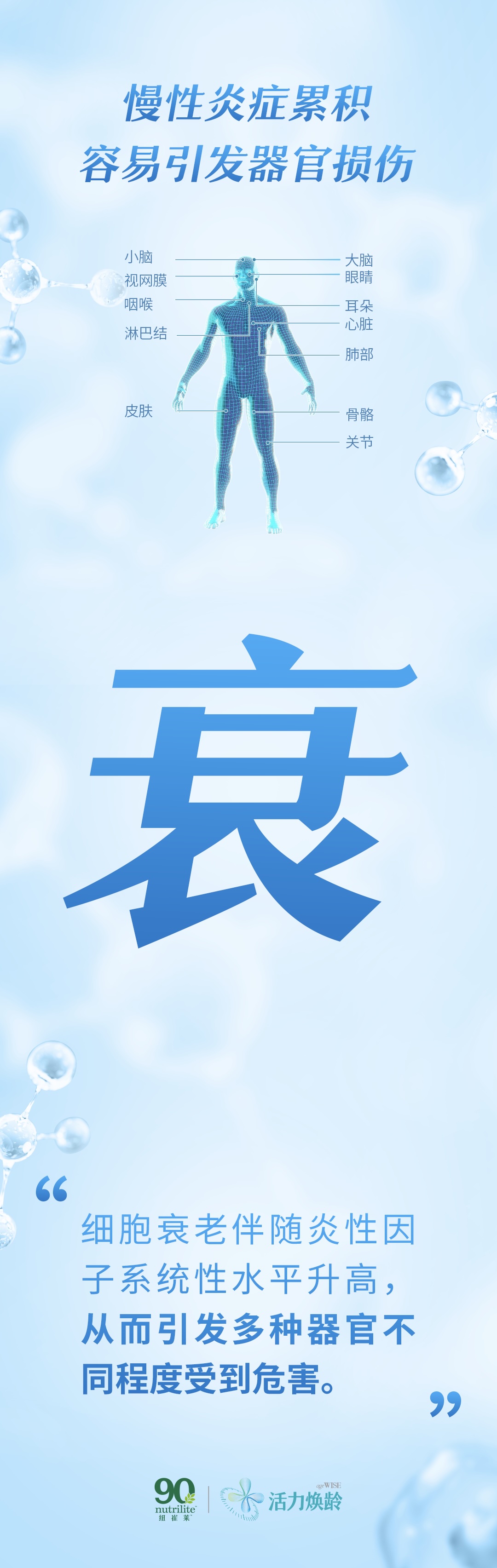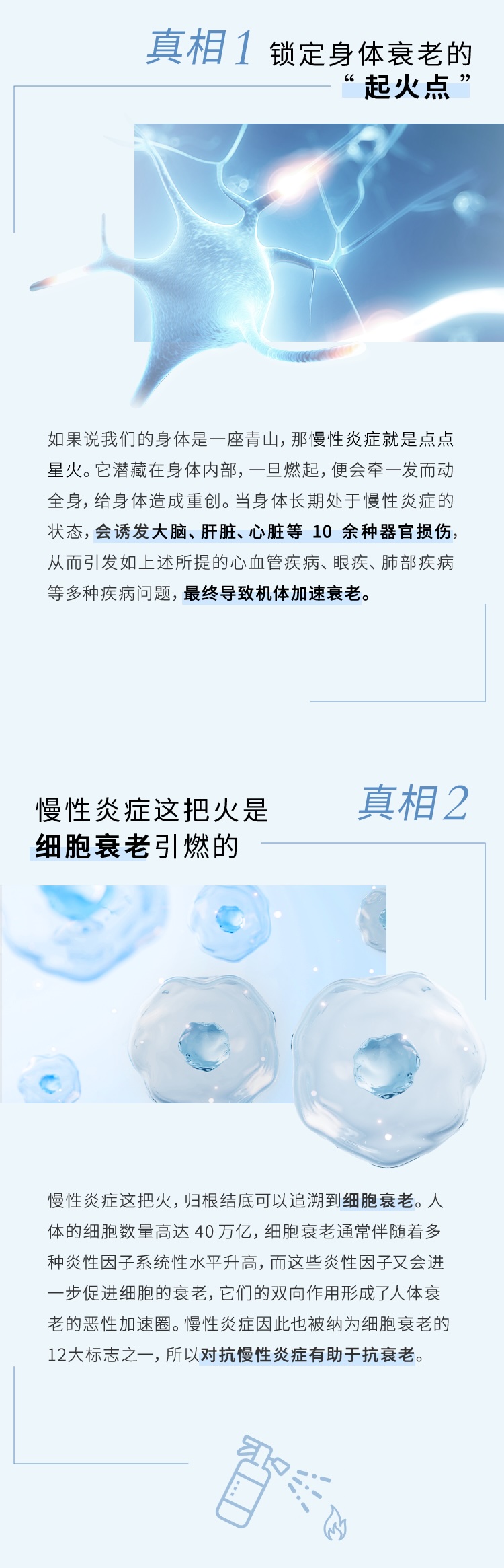 如果说我们的身体是一座青山,那慢性炎症就是点点星火。它潜藏在身体内部,一旦燃起,便会牵一发而动全身,给身体造成重创。当身体长期处于慢性炎症的状态,会诱发大脑、肝脏、心脏等10余种器官损伤,从而引发如上述所提的心血管疾病、眼疾、肺部疾病等多种疾病问题,最终导致机体加速衰老。