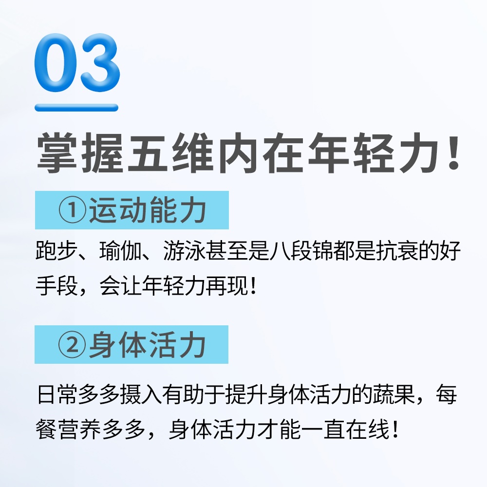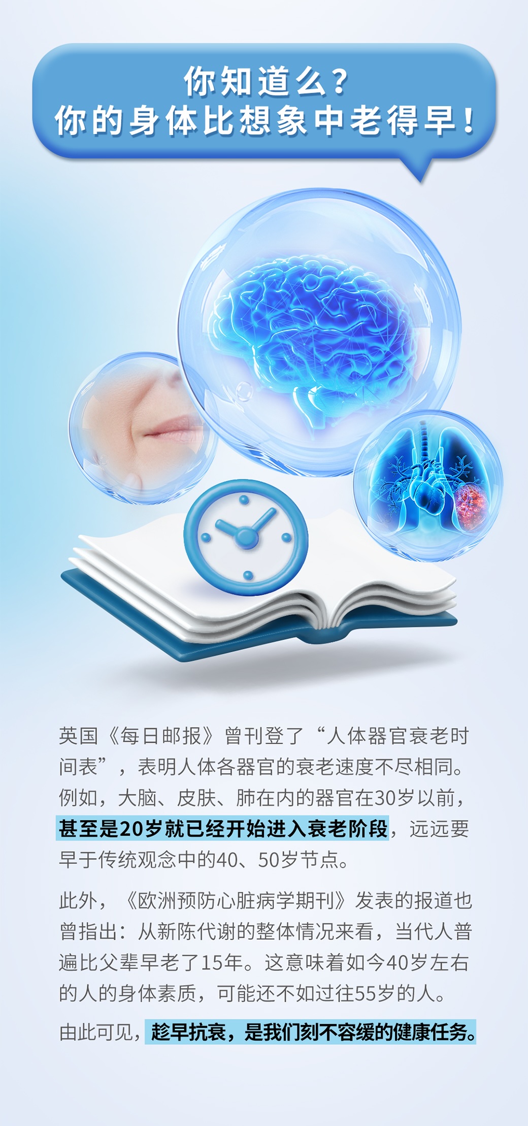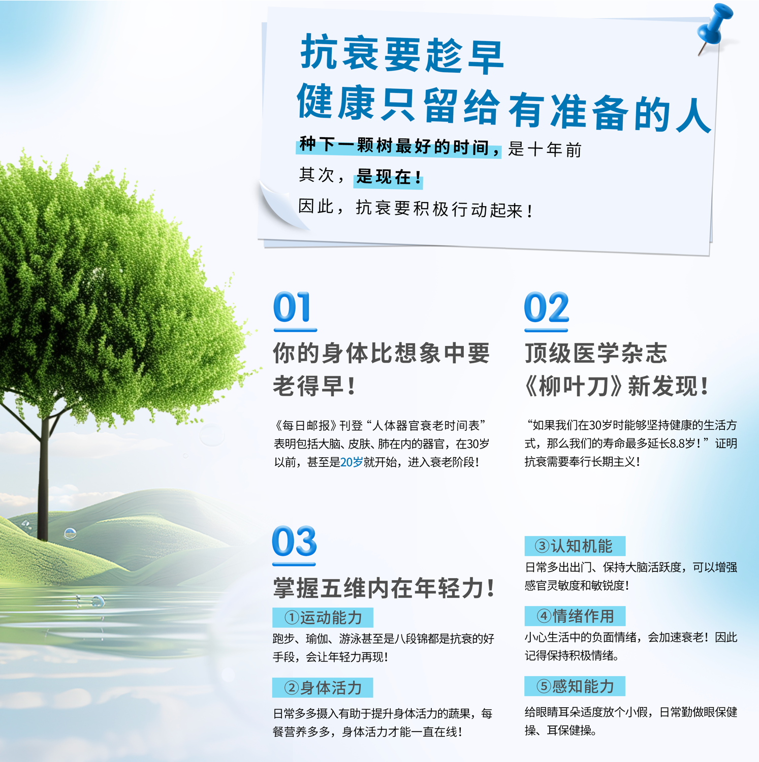抗衰不是中老年才开始的事,而是越早开始越好的“健康投资”。从今天开始,用科学方法抢占抗衰先机,即刻开启活力焕龄新篇章吧!