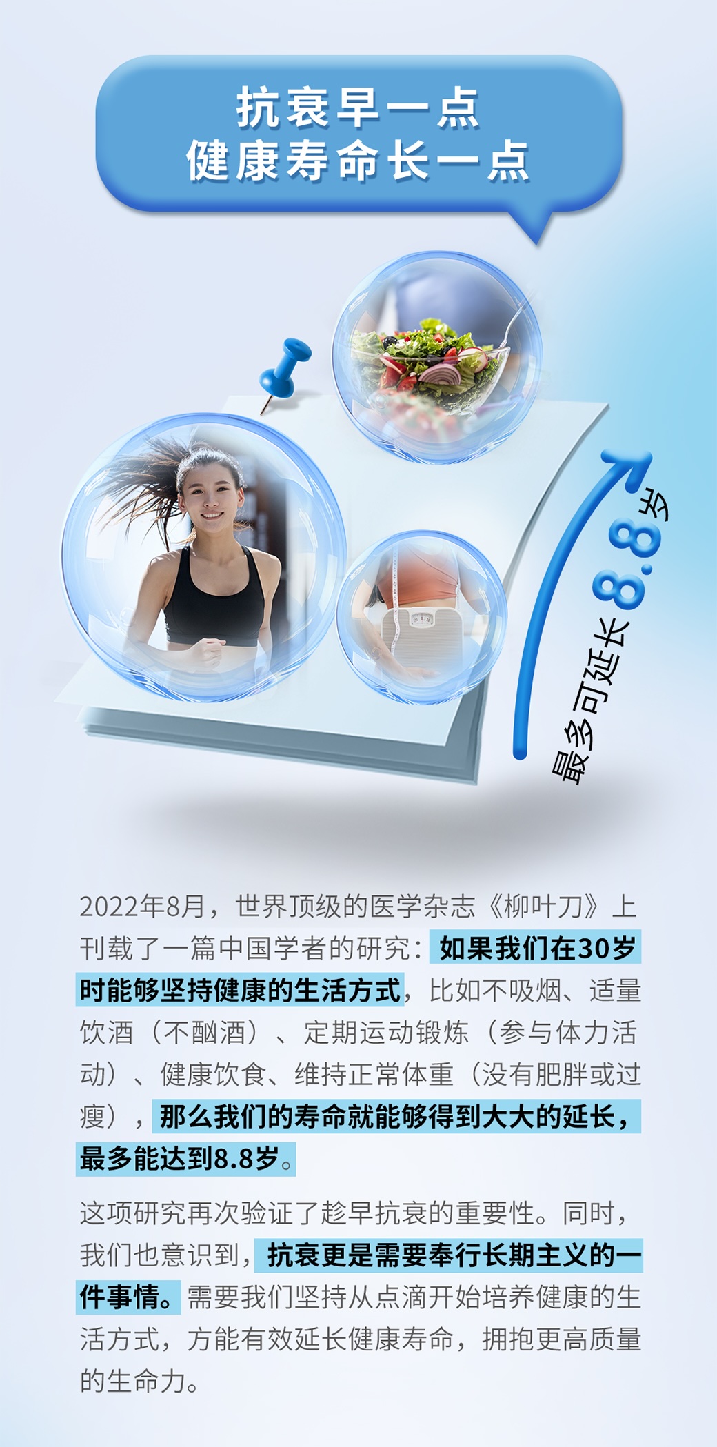 这项研究再次验证了趁早抗衰的重要性。同时,我们也意识到,抗衰更是需要奉行长期主义的一件事情。需要我们坚持从点滴开始培养健康的生活方式,方能有效延长健康寿命,拥抱更高质量的生命力。