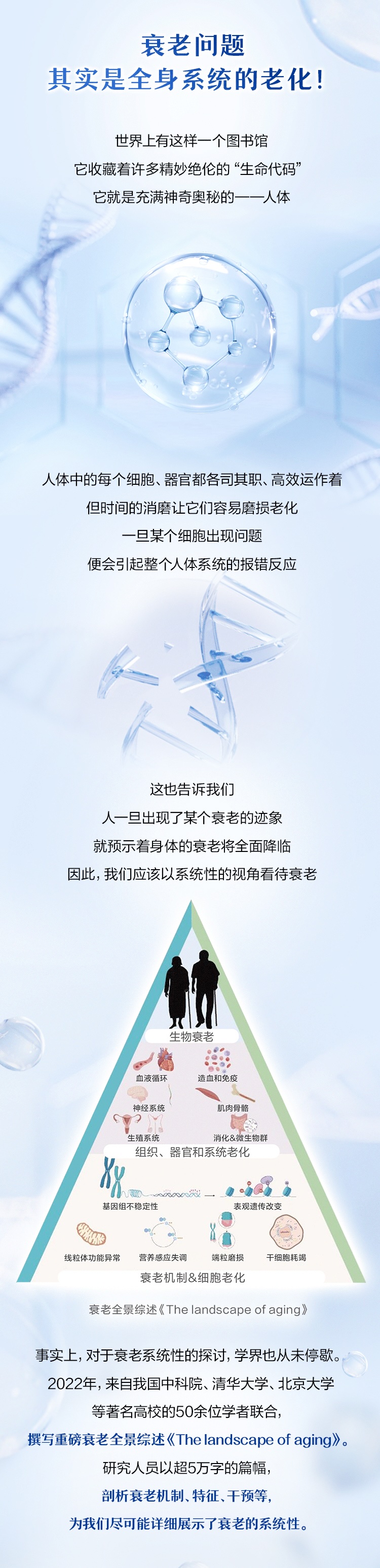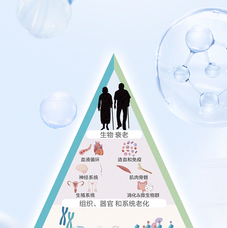 l 衰老具有系统性:一旦某个细胞出现问题,便会引起整个人体系统的报错。因此,抗衰也要从系统的角度出发;