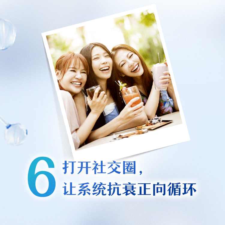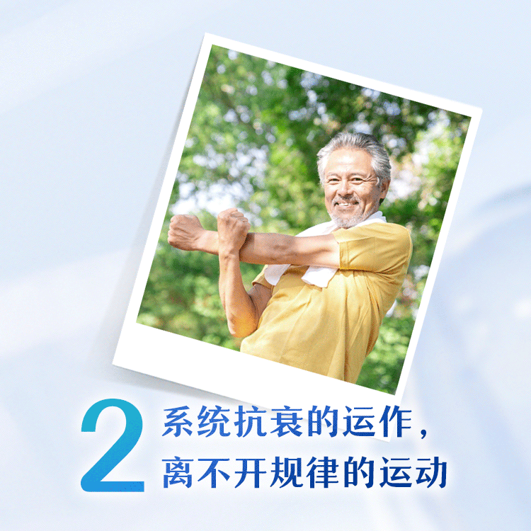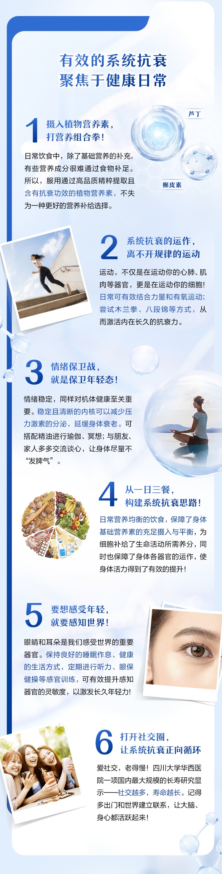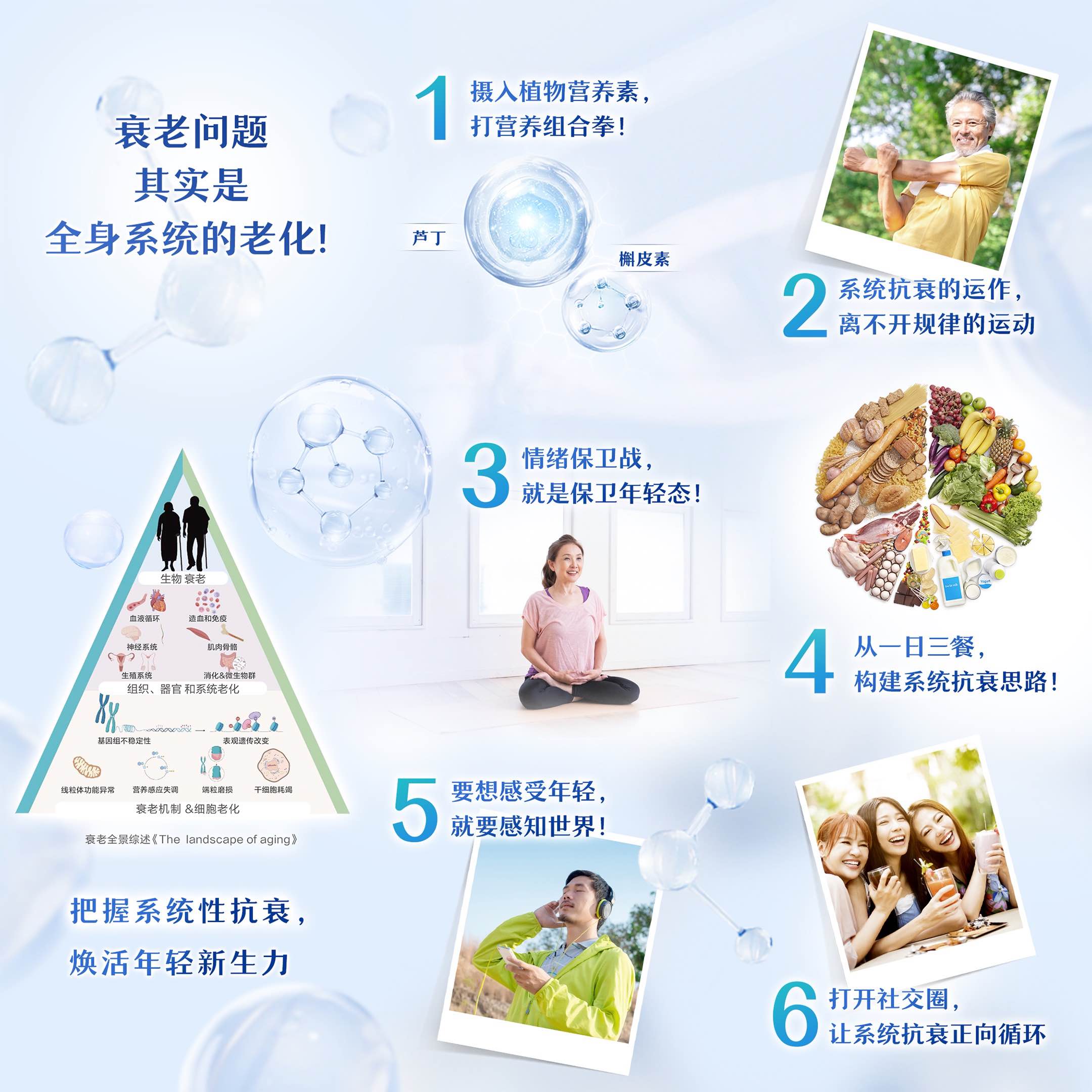 l 系统抗衰需要多维度协同:摄入含抗衰功效的植物营养素、规律运动、保持积极情绪、均衡饮食、积极社交、感官训练等多管齐下;