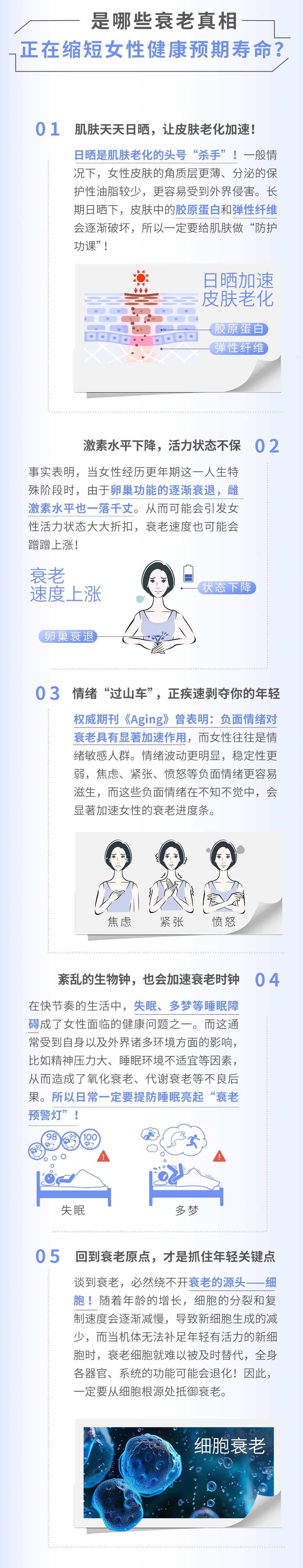 虽然女性的平均预期寿命比男性更长,但却更早面对健康挑战,也就是说女性更要提早关注衰老问题。让我们一起来了解女性特有的衰老特点,掌握专属抗衰秘诀。