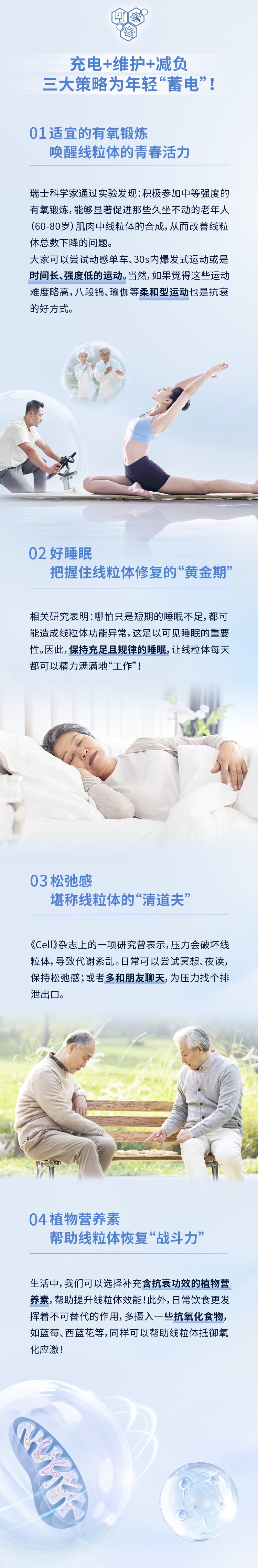 l 适当锻炼、保持充足睡眠、有效管理压力、补充具有抗衰功效的植物营养素并均衡膳食多摄入抗氧化食物,可以有效提升线粒体效能。