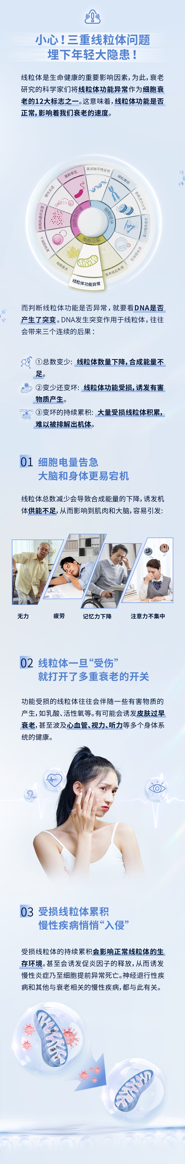 功能受损的线粒体往往会伴随一些有害物质的产生,如乳酸、活性氧等。有可能会诱发皮肤过早衰老,甚至波及心血管、视力、听力等多个身体系统的健康。