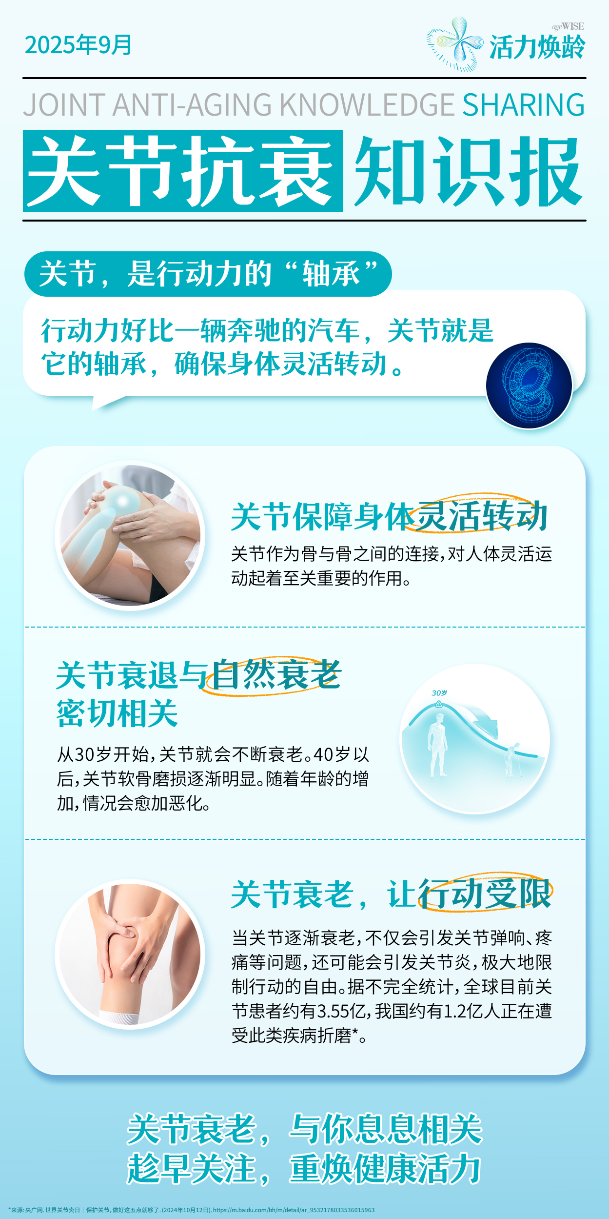 活力焕龄,关节抗衰要趁早,都说人老腿先老,我们的关节,尤其是腿部、膝关节在站立、行走和蹲起等动作中发挥重要作用。那关节的衰老会对身体行动造成哪些影响呢?它不仅会导致关节弹响、疼痛的问题,还可能会引发关节炎,让行动受限,这些都是关节衰老造成的行动力危机。那你知道这些危机离我们有多远吗?事实上,从30岁开始,关节就开始不断衰老,到50岁以后可能会逐渐发展为关节炎。据不完全统计,目前全球关节炎患者约有3.55亿,国际上还把每年的10月12日设定为世界关节炎日,这都在提醒我们,关节抗衰是每个人不得不重视的健康问题。关节衰退与人体自然衰老密切相关。一方面,我们的关节软骨细胞会随年龄增长而老化,另一方面关节氨糖也会不断流失,这就会导致无法刺激关节软骨组织的更生,影响关节润滑。因此,守护关节健康也要从两个维度入手,一方面,补充含有抗衰功效的植物营养素,根源焕活细胞,另一方面,摄入葡萄糖胺等有益成分,刺激软骨细胞合成蛋白多糖和胶原纤维,催生关节滑液,有效保护关节。同时,健康的生活方式也很关键,比如通过注意适度运动、使用辅助工具等方式减轻关节负担。请坚持科学抗衰,重焕关节健康,一起为强健行动力而努力。