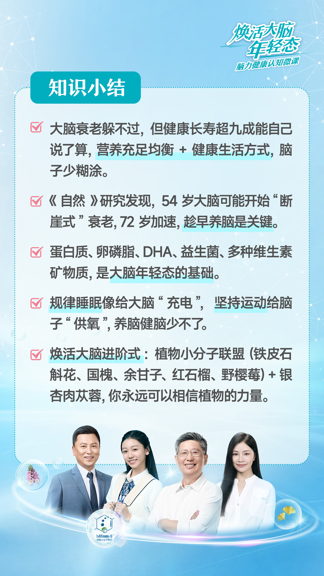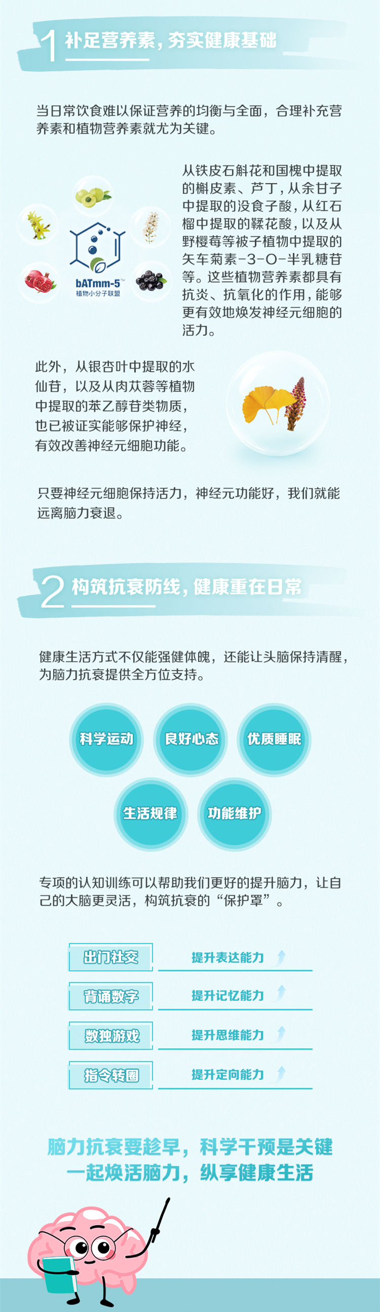 “好生活+足营养=脑活力”。但这只是起点,想进一步筑牢大脑防线?你永远可以相信植物的力量。当你践行养脑,我们最棒的大脑会不断自我调整,扮演好身体预算官的角色,在每一个当下都呈现出聪明清醒的模样。