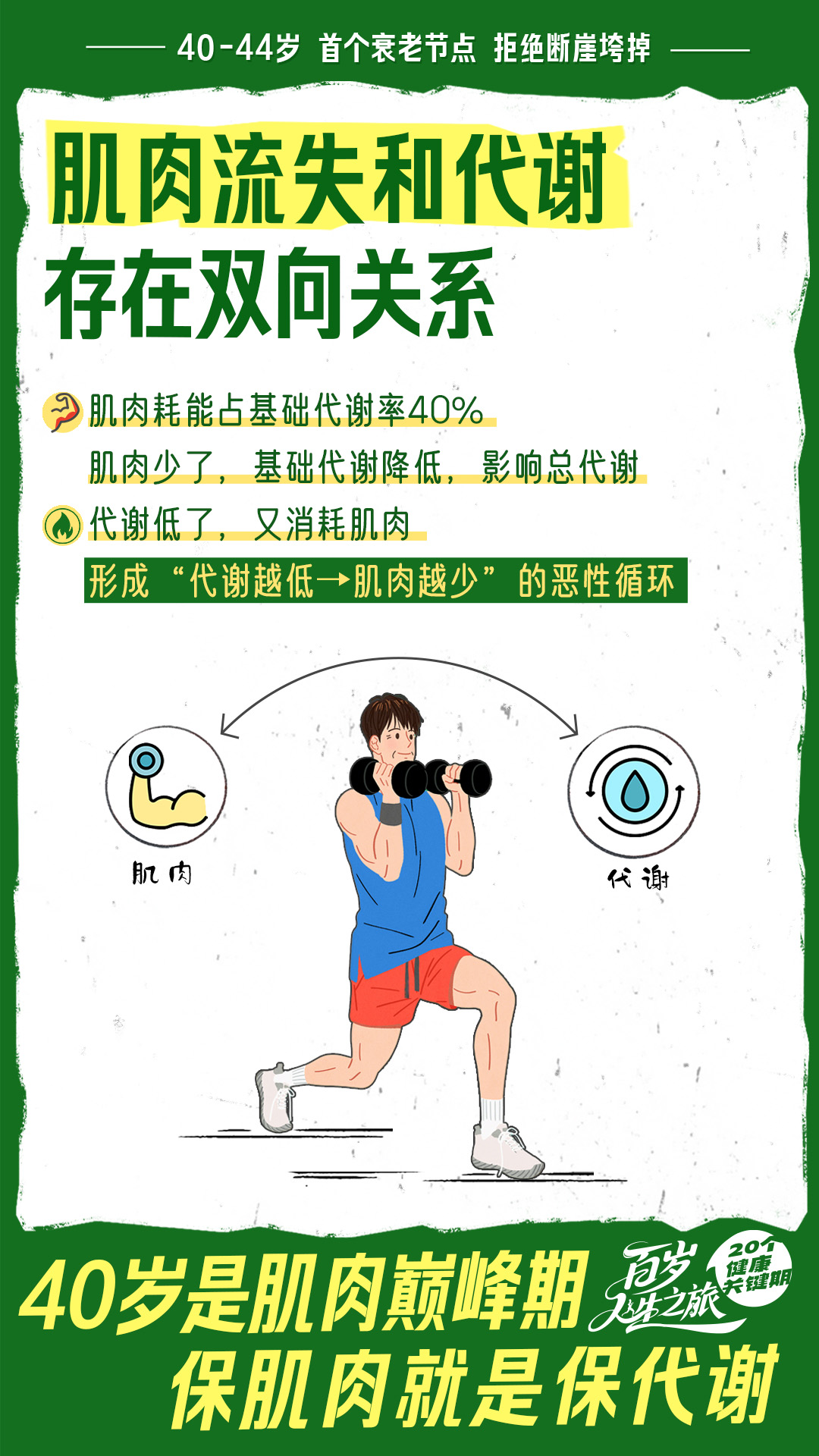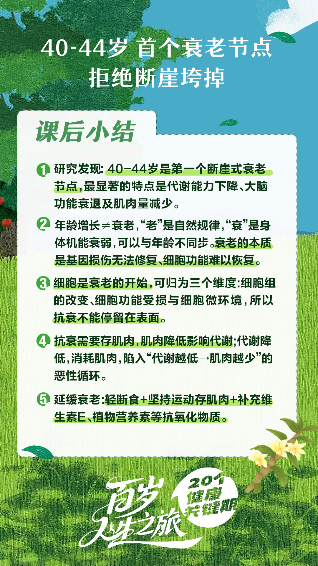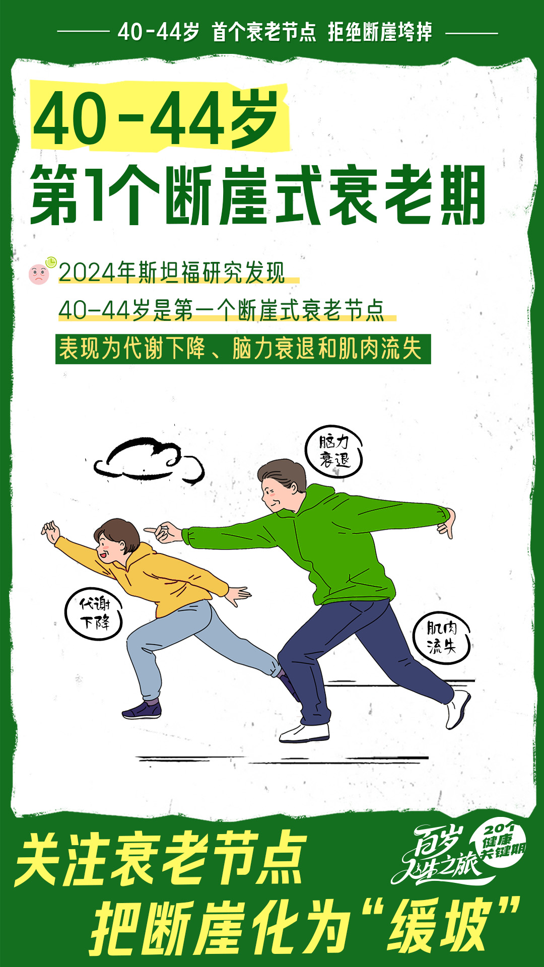 你知道吗?人的衰老不是匀速的,而是在某个年龄就突然老了。研究发现,40-44岁是断崖式衰老的第一个节点,我们会出现代谢下降、脑力衰退和肌肉流失。那么,怎么做才能让衰老来的慢一些?甚至把断崖变缓坡呢?一起来看看吧。