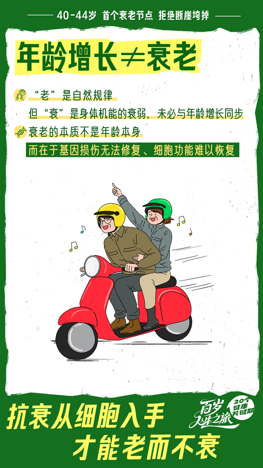 年龄增长≠衰老,“老”是自然规律,“衰”是身体机能衰弱,可以与年龄不同步。衰老的本质是基因损伤无法修复、细胞功能难以恢复。