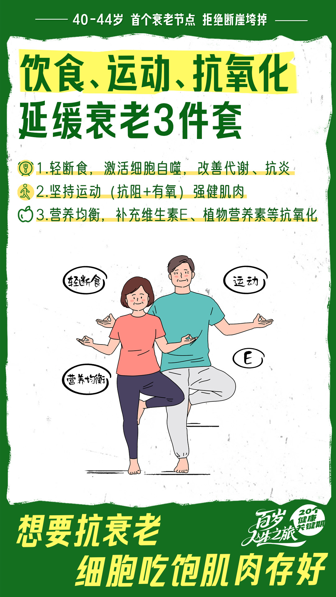延缓衰老:轻断食+坚持运动存肌肉+补充维生素E、植物营养素等抗氧化物质。