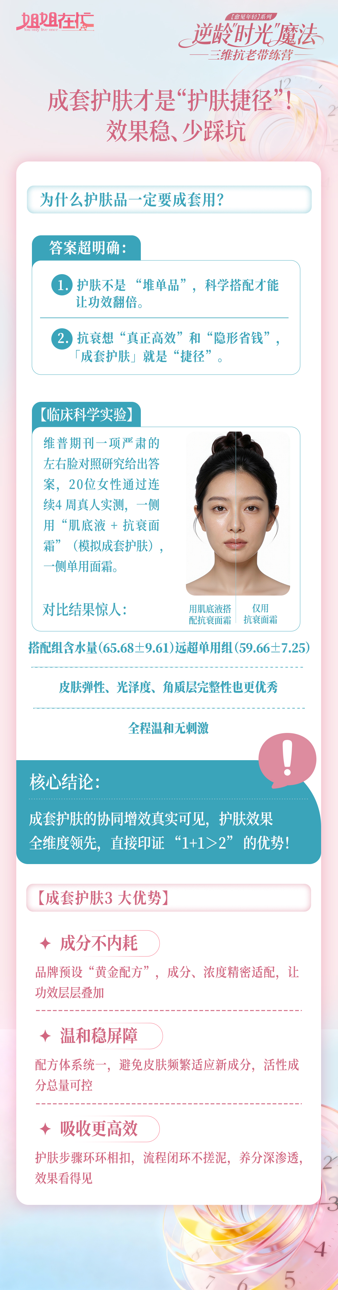 划重点:混搭没有专业护肤配方支撑,容易踩坑,既费钱还可能给皮肤添负担。下午干货分享:如何靠成套护肤的协同 buff,拉满抗老能量,更快实现年轻目标~