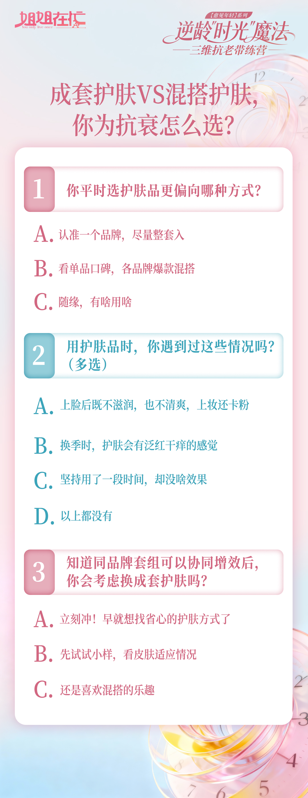 姐妹们,上午咱们聊了成套护肤和混搭护肤,做个选择题来看看你的护肤习惯~