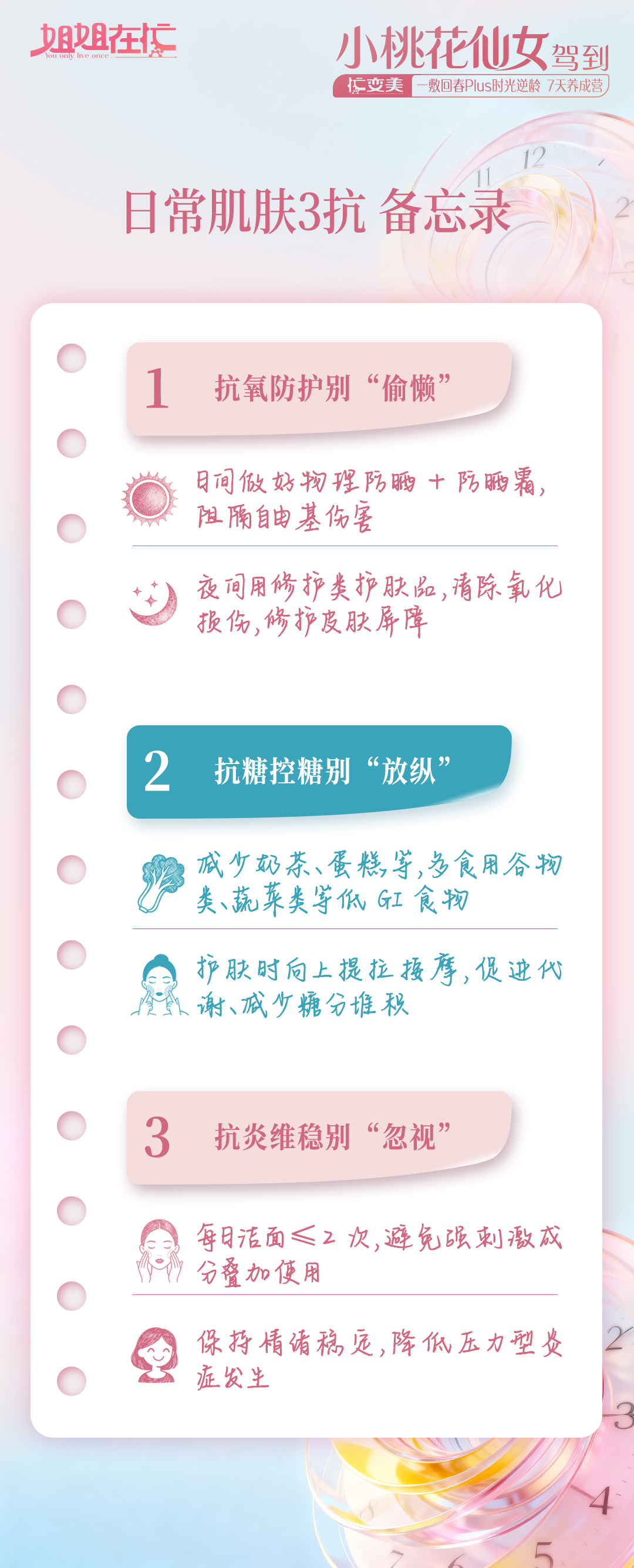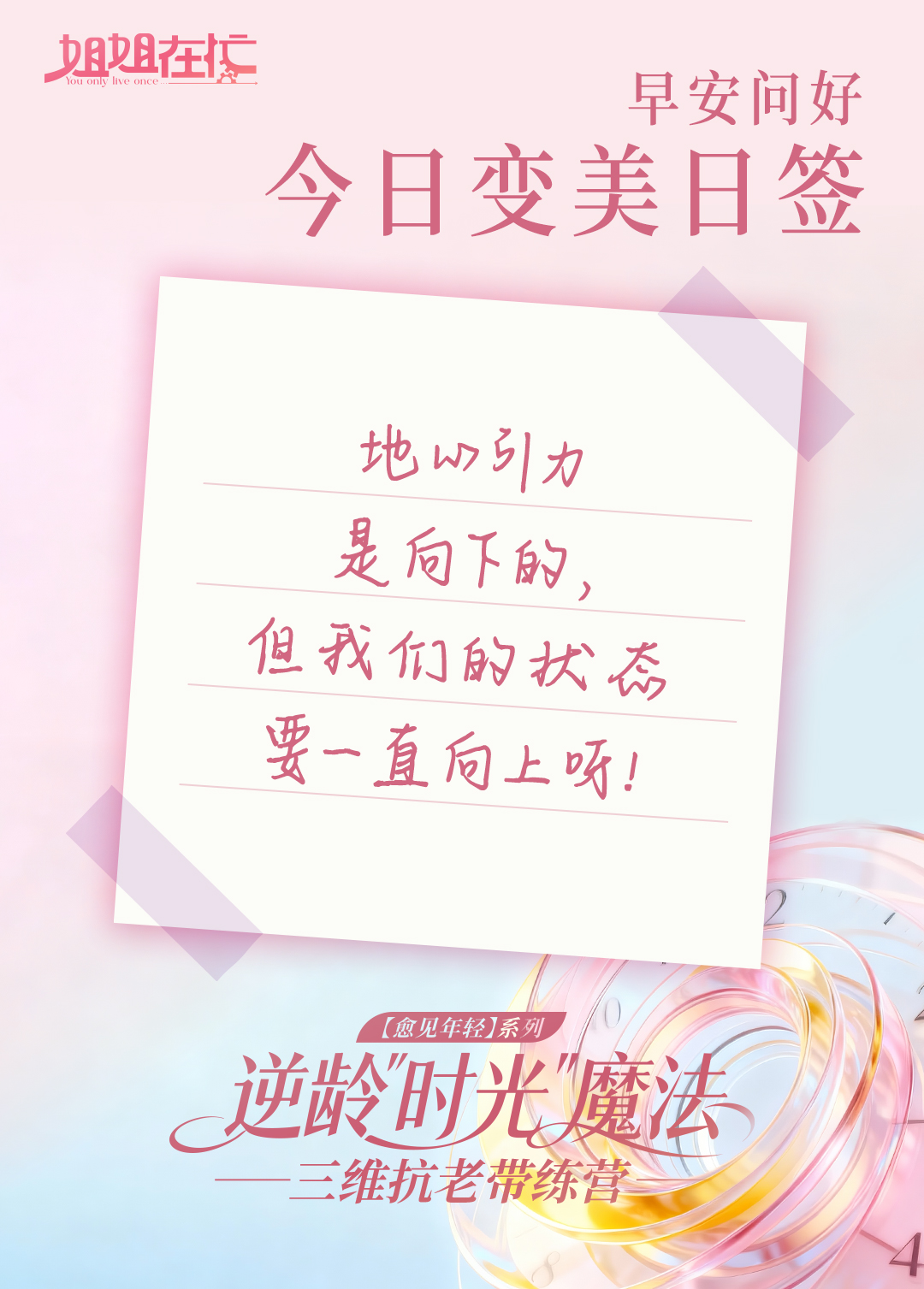 从今天起,咱们用科学抗衰的理念和方法,通过专业分享和互相督促,帮大家稳稳守住肌肤好状态,养出透亮桃花肌,一起解锁时光逆龄的惊喜~快领取今日变美日签哦