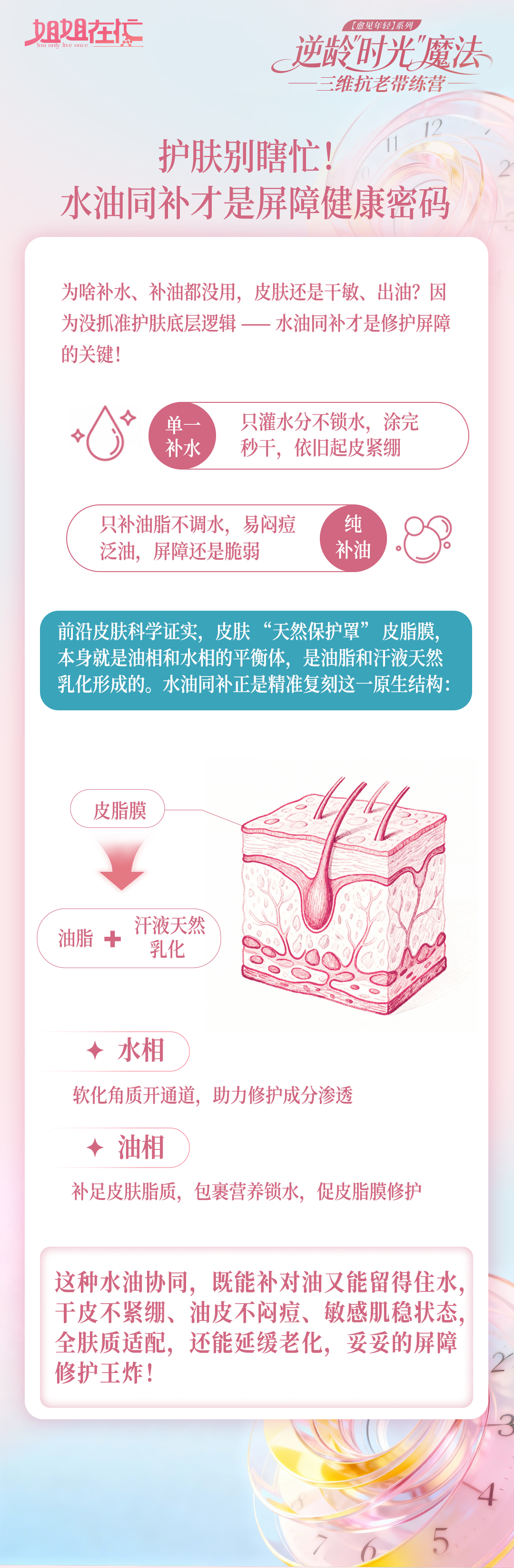 原来水油平衡是抗衰的“地基”,从干纹到毛孔问题都能精准覆盖!别忘了晚上一起来群里护肤打卡,解锁“水油平衡=抗衰地基”的底层逻辑~