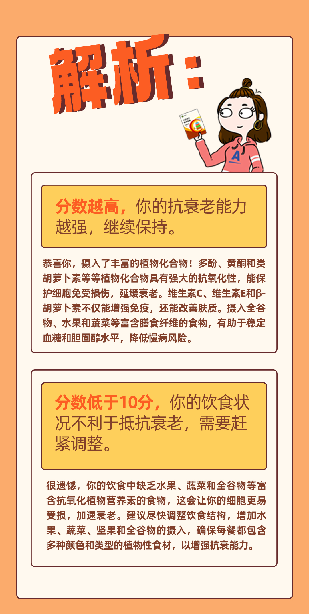 分数低于10分,你的饮食状况不利于抵抗衰老,需要赶紧调整。