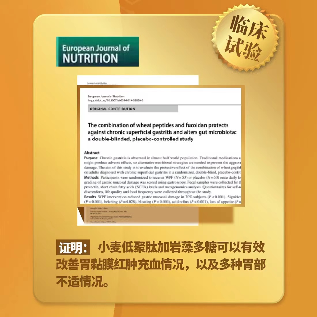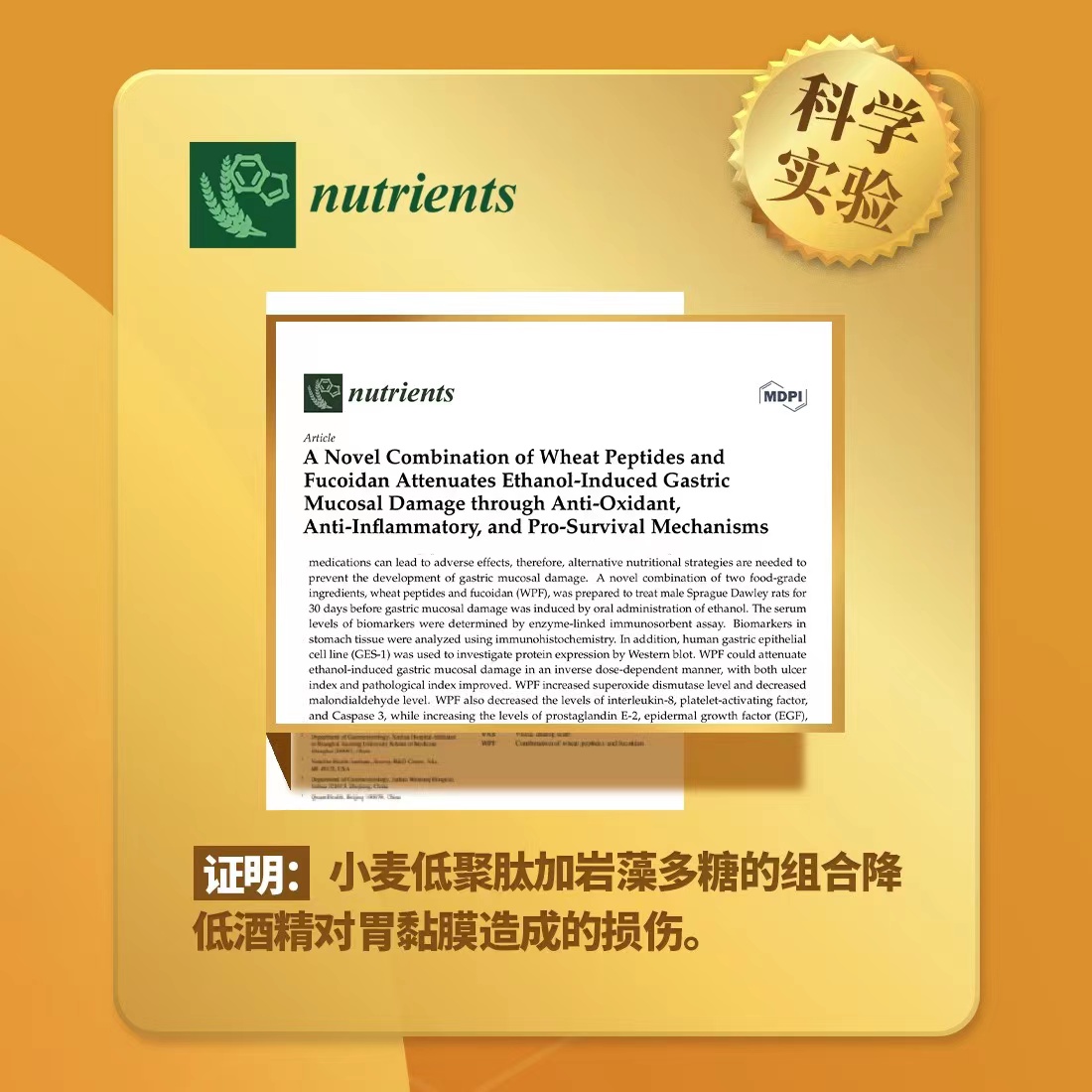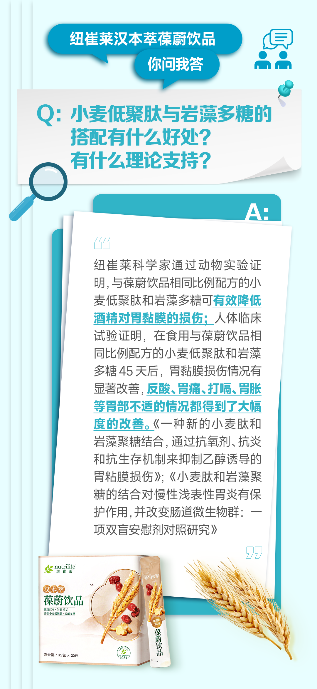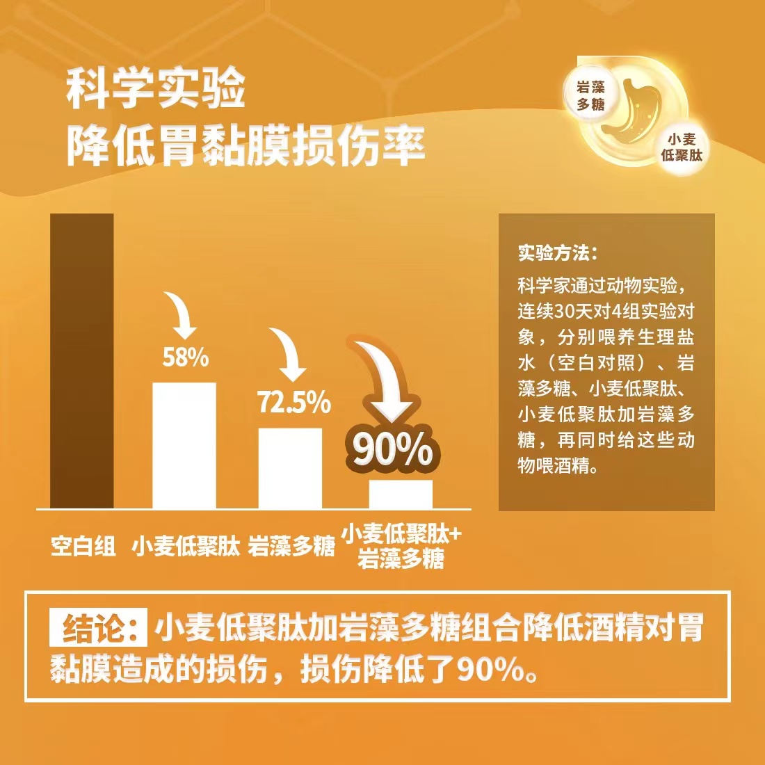 纽崔莱的葆蔚饮品,使用的就是小麦低聚肽+岩藻多糖的配方。在动物试验中,发现小麦低聚肽+岩藻多糖组合,降低了90%的胃粘膜损伤,改善了70%的胃粘膜红肿。