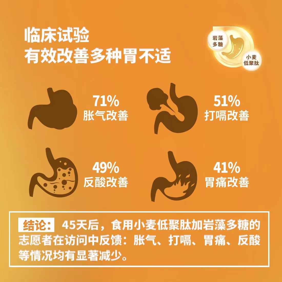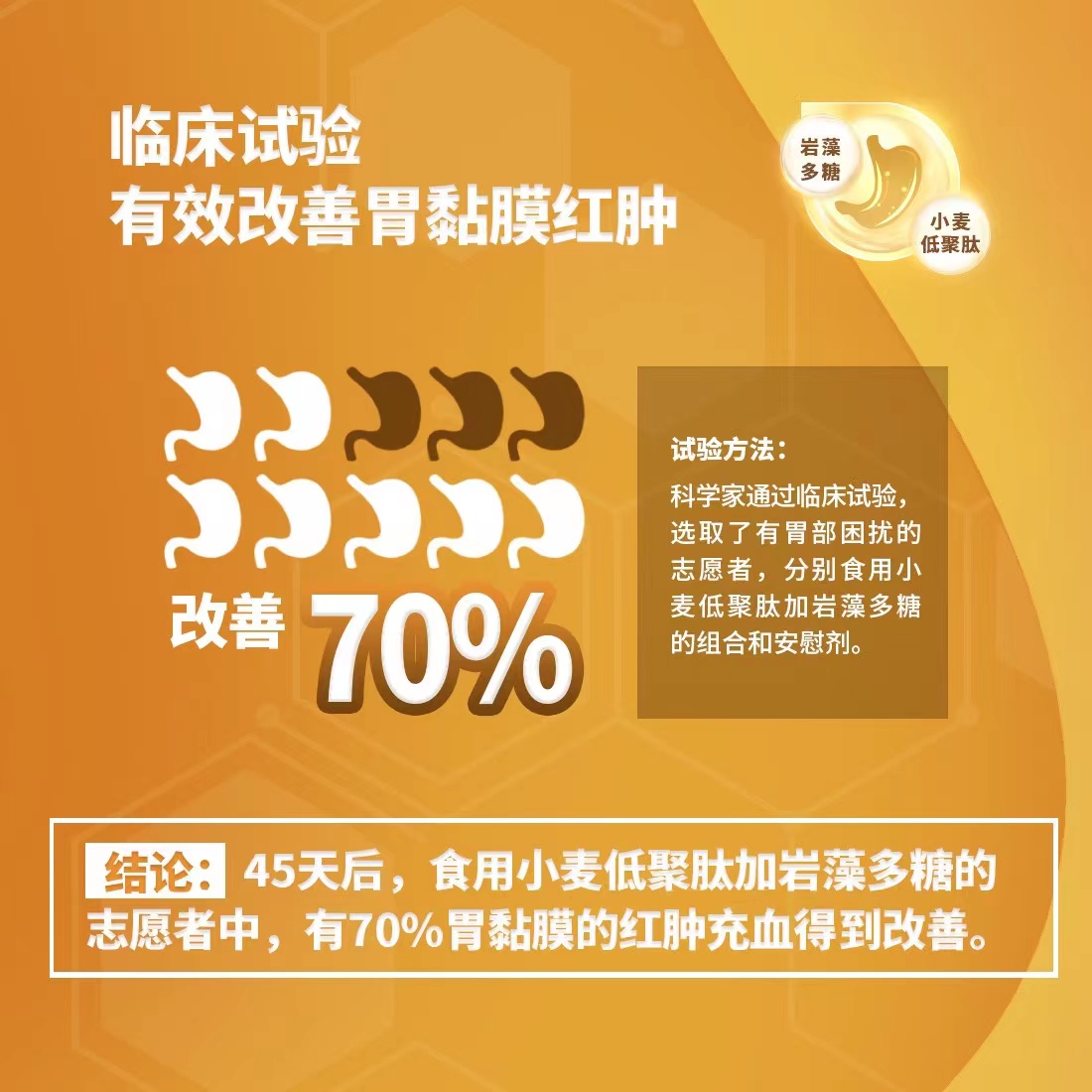 小麦低聚肽和岩藻多糖是什么?大多数人可能未曾听说过小麦低聚肽和盐藻多糖。现代研究发现,这两种成分能够有效修复胃黏膜,具有养胃护胃的作用。并且它们的效果具有一加一大于二的特点。根据一项科学实验,这两种成分联合使用可以显著降低酒精对胃黏膜的损伤,降幅高达90%。此外,人体临床试验还揭示了连续45天食用该组合的益处,结果显示70%的参与者胃黏膜状况得到显著改善。同时,反酸、胃痛、打嗝、胃胀等不适症状也有了大幅度的改善。因此,这款产品在保护胃部健康方面效果显著。若进一步结合生姜和红枣这两种具有健脾养胃功效的传统中药材,现代精粹与传统汉方的完美结合,将使我们能够更轻松地实现全面的胃部养护。相信身体的力量胃篇汉方精萃一步到胃
