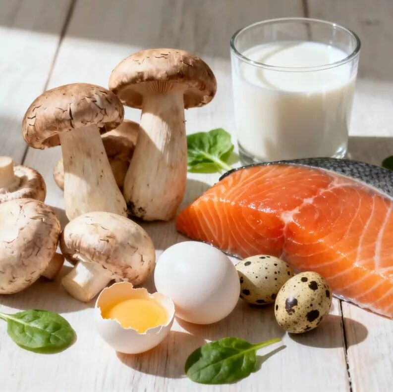 日常膳食是补充的基础,可多吃深海鱼类(如三文鱼、鲭鱼)、动物肝脏、蛋黄、蘑菇等天然富含维生素D的食物。此外,额外添加维生素D的牛奶、酸奶等,也可作为膳食补充。