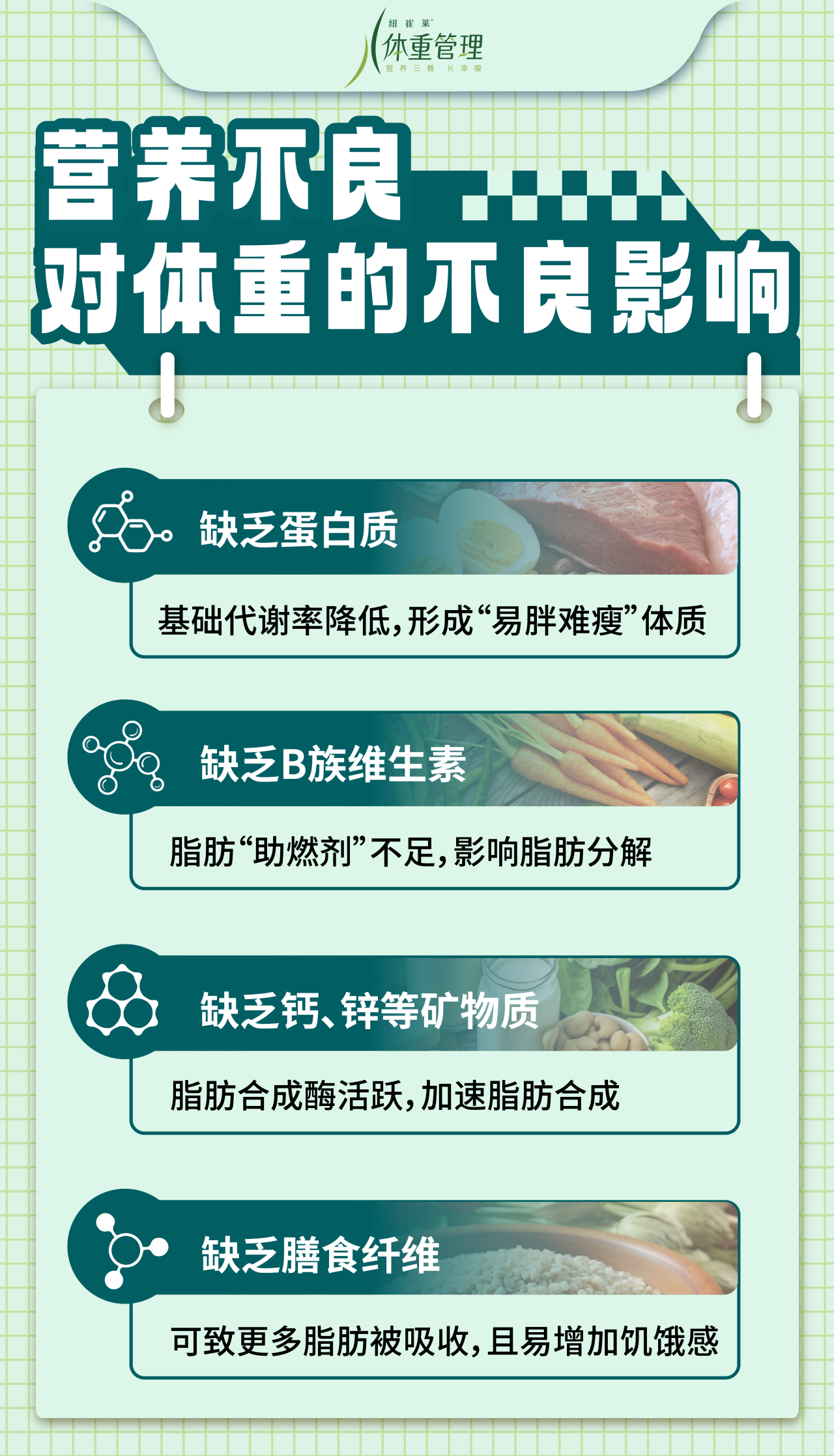 因为在热量和脂肪的代谢中,多种营养素都参与其中,扮演不同角色。若营养不良,各类营养素的缺口对体重会有多种不良影响。