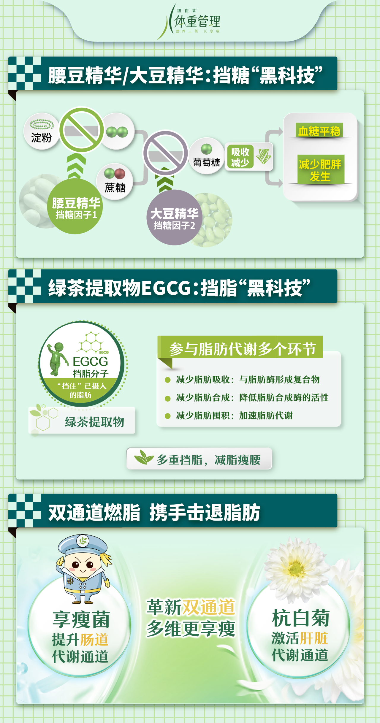 例如腰豆精华、大豆精华就可以挡糖;绿茶提取物有助于脂肪燃烧;“享瘦菌”和杭白菊甚至还可以联手助力燃脂。大餐无忧与快乐享瘦将不再是一道选择题。