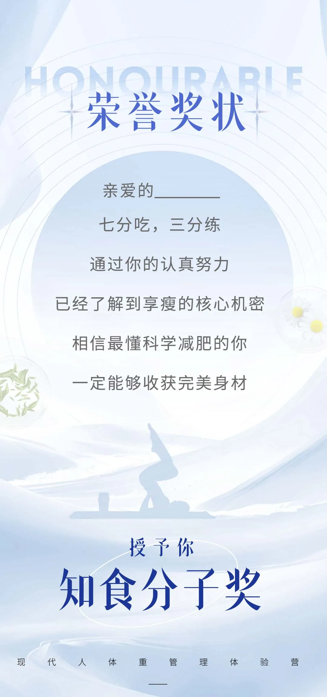 接下来要颁发的是【知食分子奖】,这个奖大家猜猜我要颁给哪些人?没错,我们要颁给每天认真对待自己三餐的减肥侠们。俗话讲七分吃,三分练。你们已经掌握了享瘦的核心机密,相信在不久的将来一定能够收获完美身材。