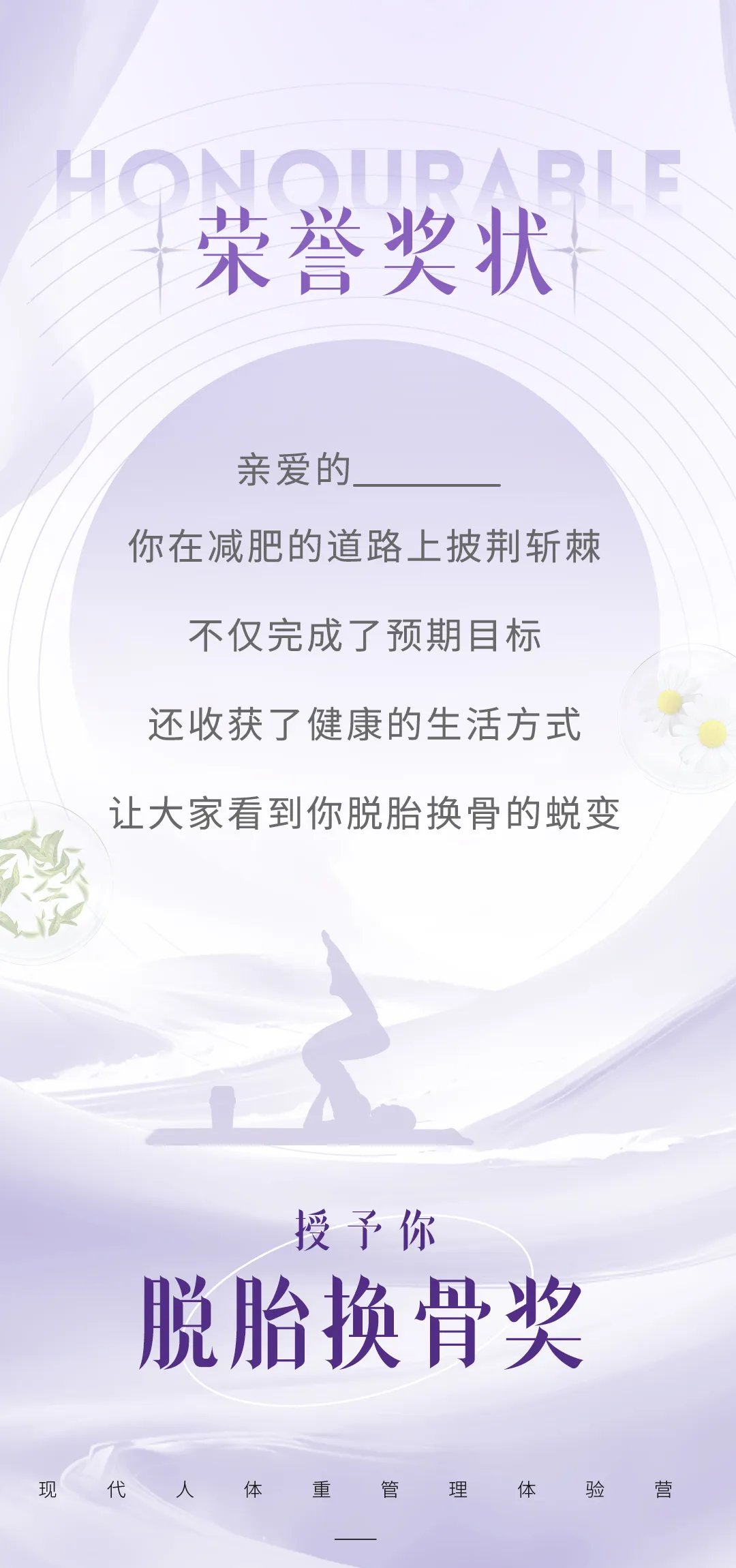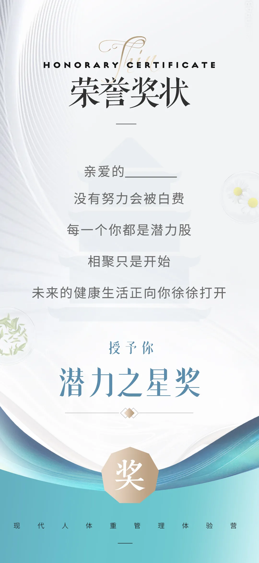 导语:Ladys and gentlemen~请把注意力聚焦到彼此身上,因为接下来我们要做一件非常重要的事情。那就是给大家颁奖~!哈哈,没想到吧,减肥也有奖可以拿。是的!因为你们真的很优秀,在过去的14天里,每个人都带着空杯心态,学习新观点并认真实操。很高兴,很多家人已经有了巨大的改变,更多的家人也在往更好的方向前行。今天,我想把这4项奖项颁给大家,作为我们一同战斗过的见证。
