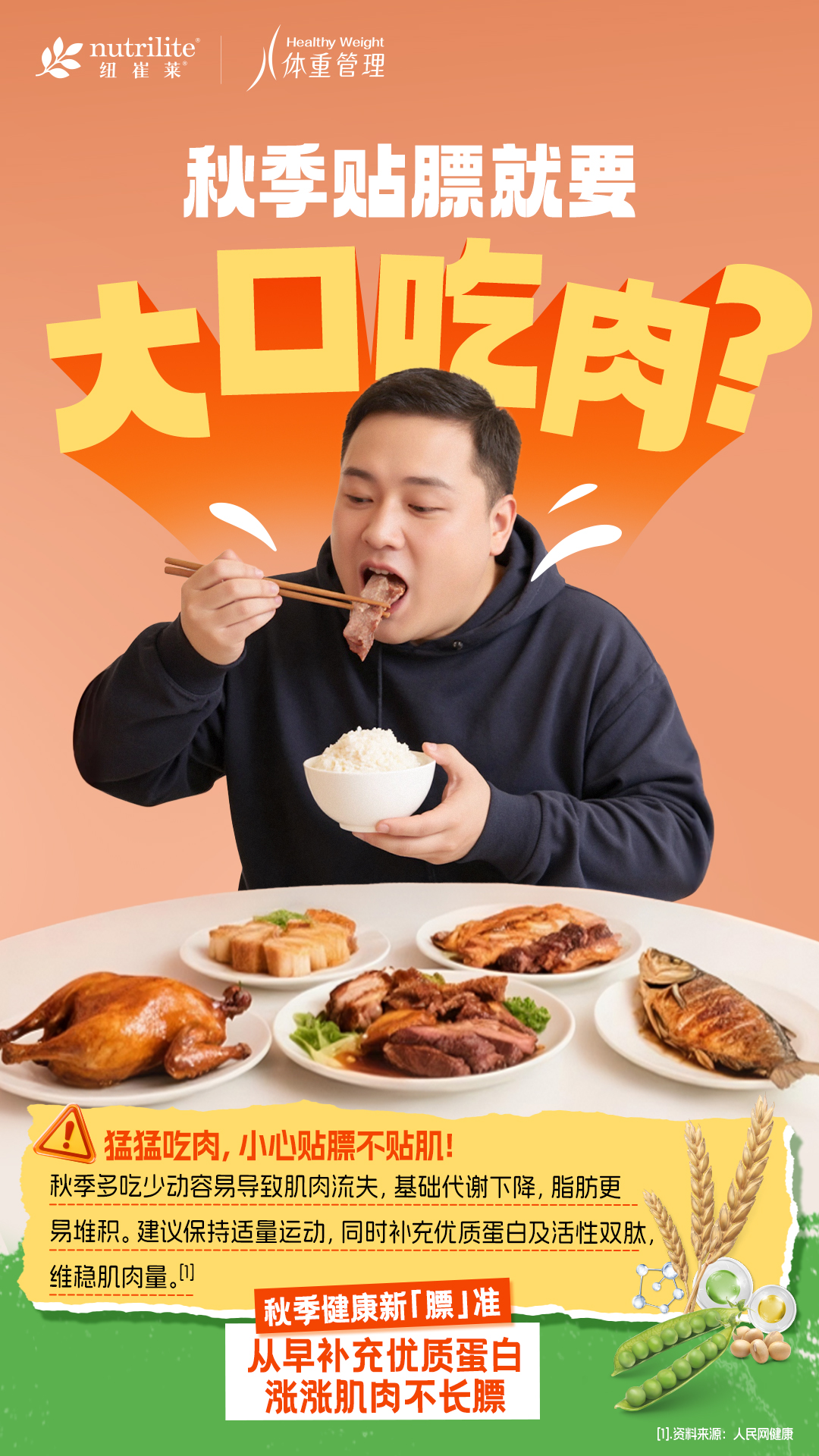 秋季多吃少动容易导致肌肉流失,基础代谢下降,脂肪更易堆积。建议保持适量运动,同时补充优质蛋白及活性双肽,维稳肌肉量。[1]