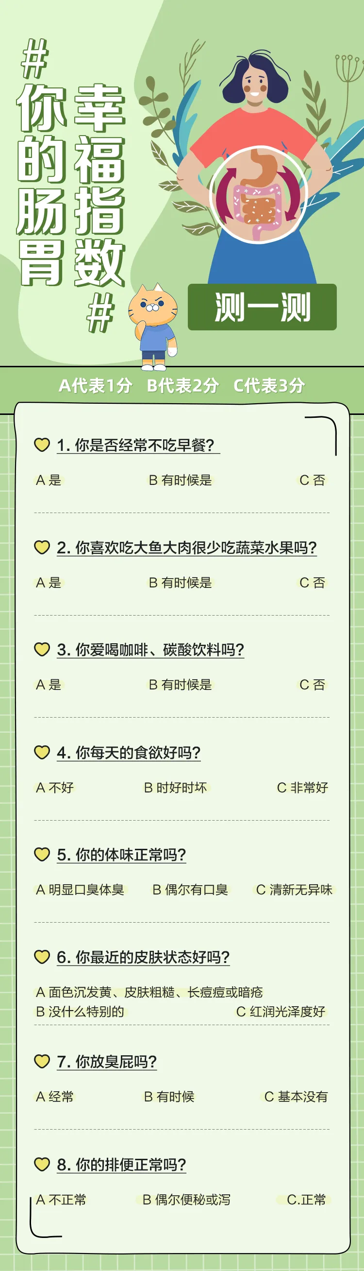 导语:家人们,如果我问你们,你觉得自己幸福吗?你肯定能回答。但如果我问,你觉得你的肠道幸福吗?我想大部分人答不上来。其实啊,我们的肠道也有幸福指数,肠道不幸福,减肥效果要打折。一起来测测吧。