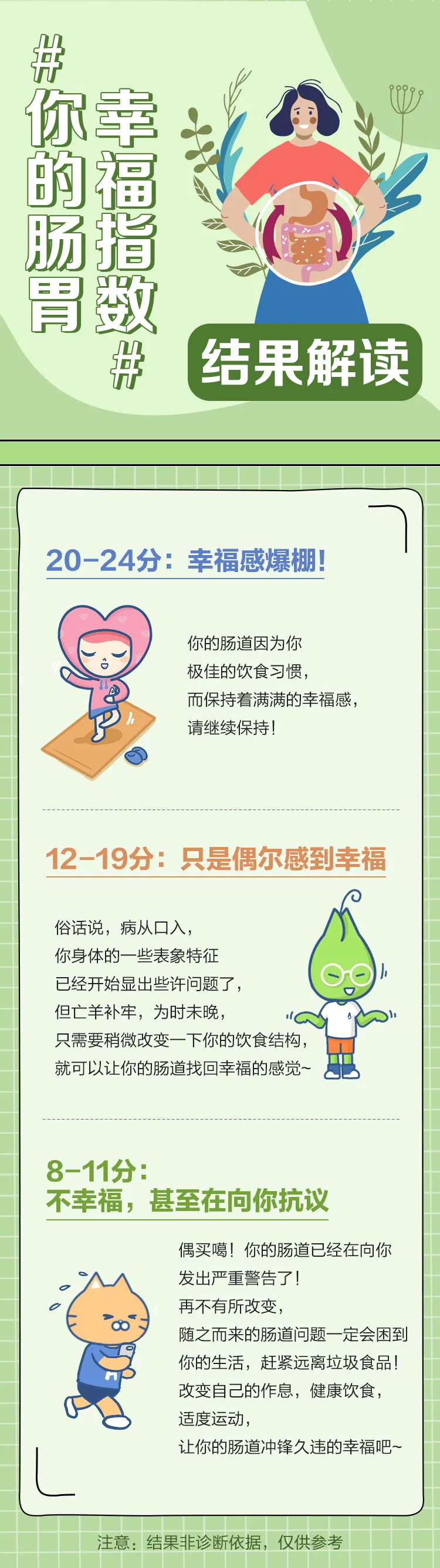 大家都测好了吗?我要公布答案了,有20分以上的吗?群里举手我看看🙋。恭喜你们,作为你们的肠道太幸福了。低于20分的亲们也不要气馁,因为我们可以提升肠道的幸福哦。一起对着结果看看吧~