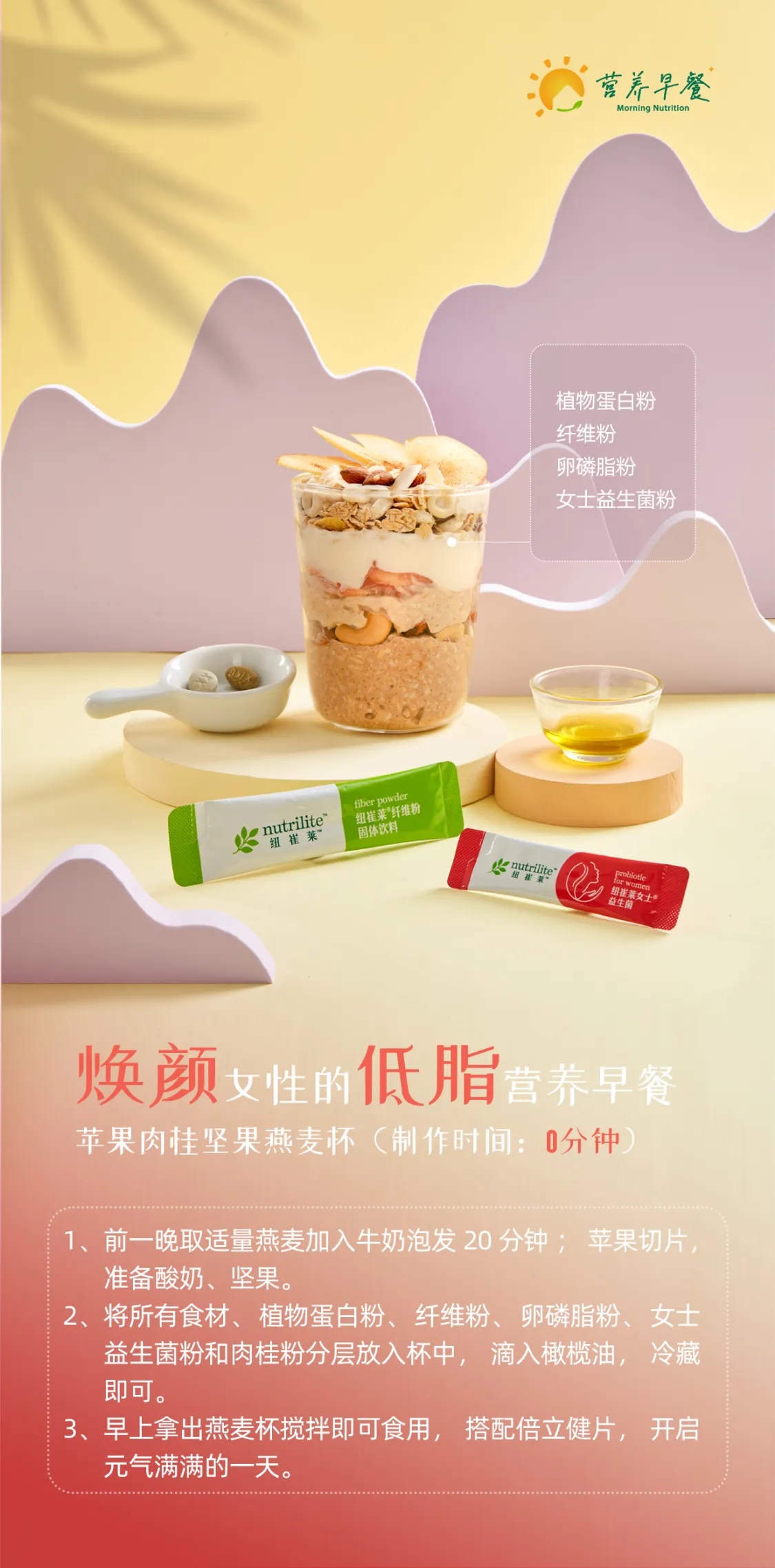 2、将所有食材、植物蛋白粉、纤维粉、卵磷脂粉、女士益生菌粉和肉桂粉分层放入杯中,滴入橄榄油,冷藏即可。