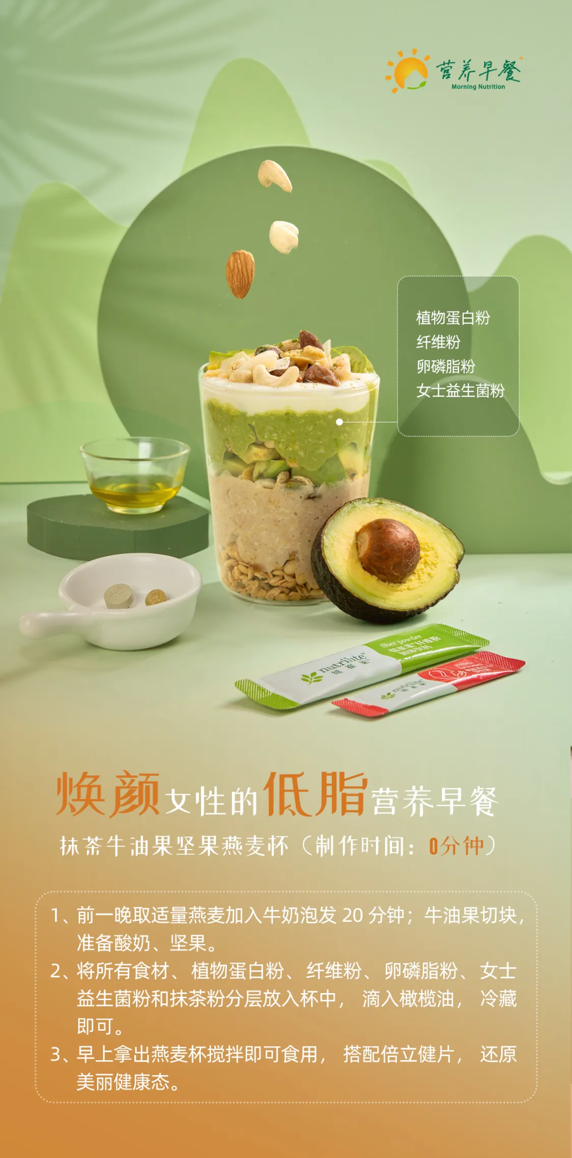 2、将所有食材、植物蛋白粉、纤维粉、卵磷脂粉、女士益生菌粉和抹茶粉分层放入杯中,滴入橄榄油,冷藏即可。