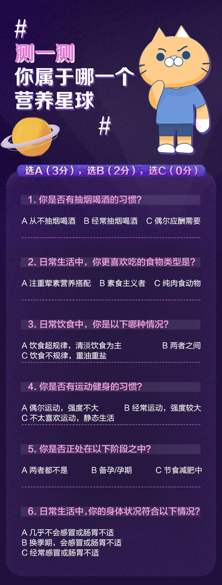 导语:嗨,减肥的间隙来休息一下。大家都知道,健康的瘦下来才是我们的目的。要想健康躺瘦,那营养绝对要到位。趁着这个悠然时刻,我们一起玩个小测试,看看你属于哪个营养星球?只有6个选项,很轻松哦。