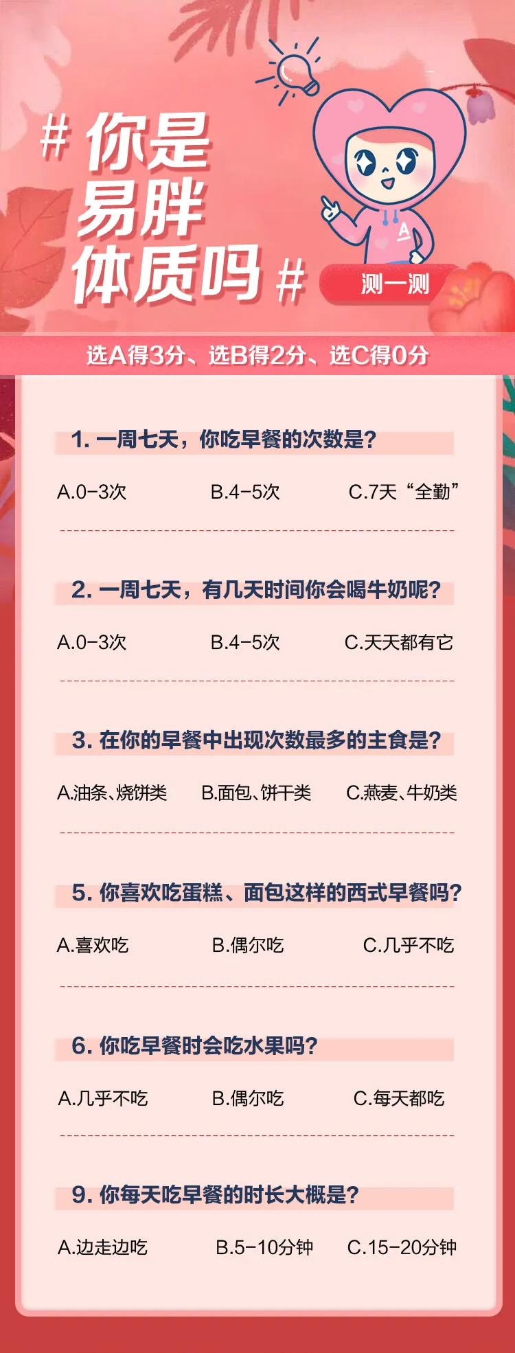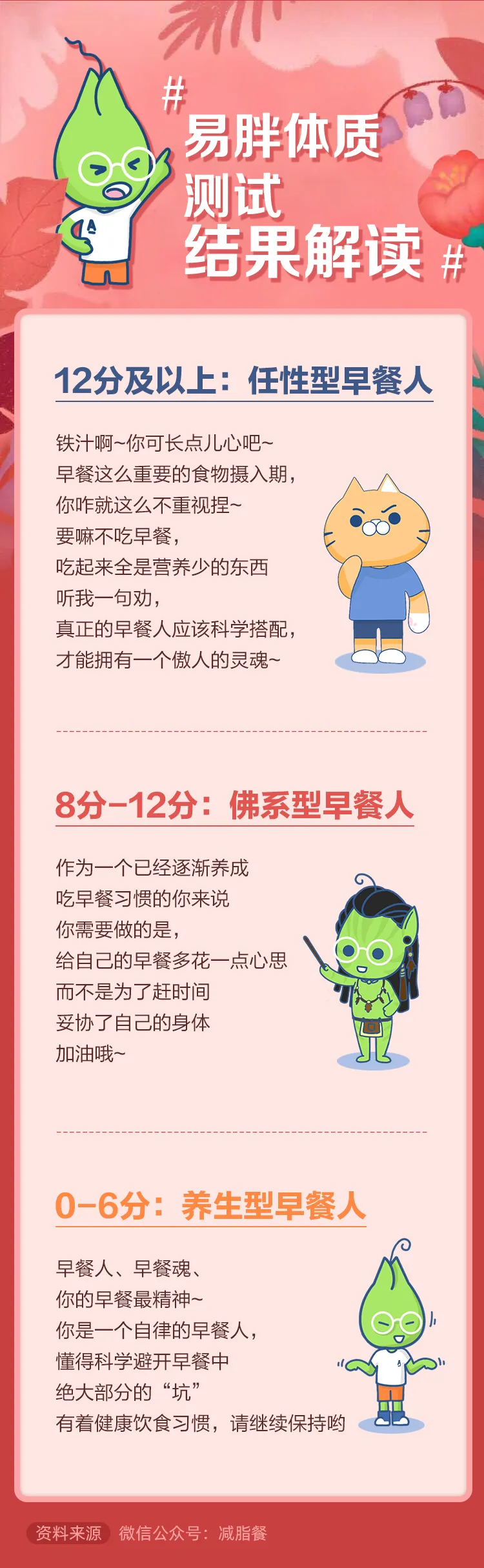家人们,你们是不是也有这样的烦恼?减肥期间一顿操作猛如虎,上秤一看傻眼了,怎么变化不大呢?如果你也是一吃就胖,忍饥挨饿也不见瘦,那很可能是“体质”的问题。让我们来测试一下吧🔮,看看你是“易胖体质”吗?记得把分数发到群里哦。