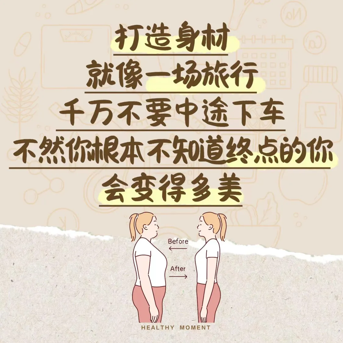 睡前想送大家一段感悟:每个胖子都是潜力股,只有瘦下来,你才知道自己有多美,你会发现整个世界都变得温柔了,全世界都会为你让道。还是那句话,打造理想中的身材,是一场长期旅行,在旅途上你唯一要做的,就是不要轻易放弃。我很期待见到抵达终点的那个美好的自己,大家一起加油,明天见。