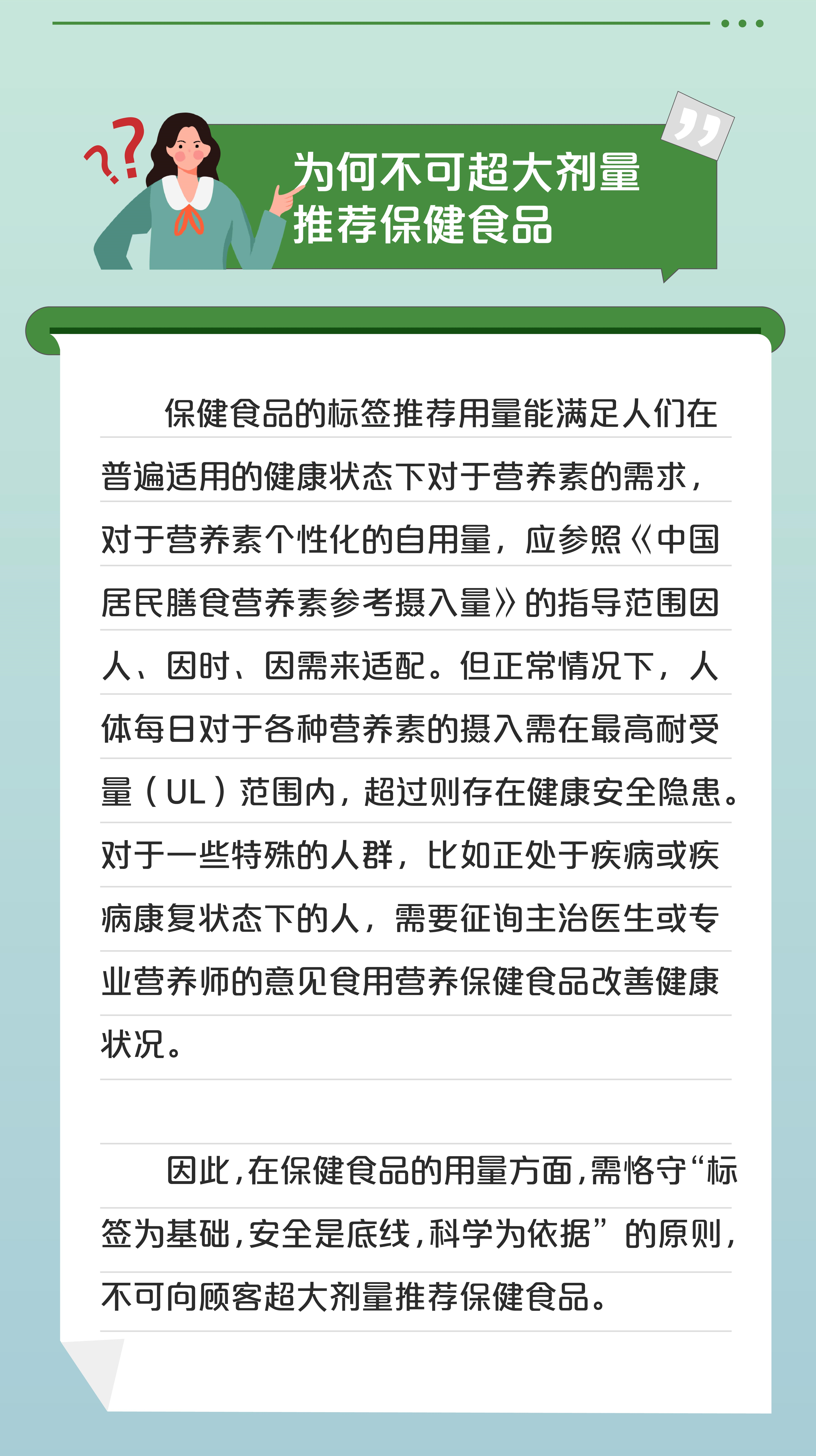 因此,在保健食品的用量方面,需恪守“标签为基础,安全是底线,科学为依据”的原则,不可向顾客超大剂量推荐保健食品。