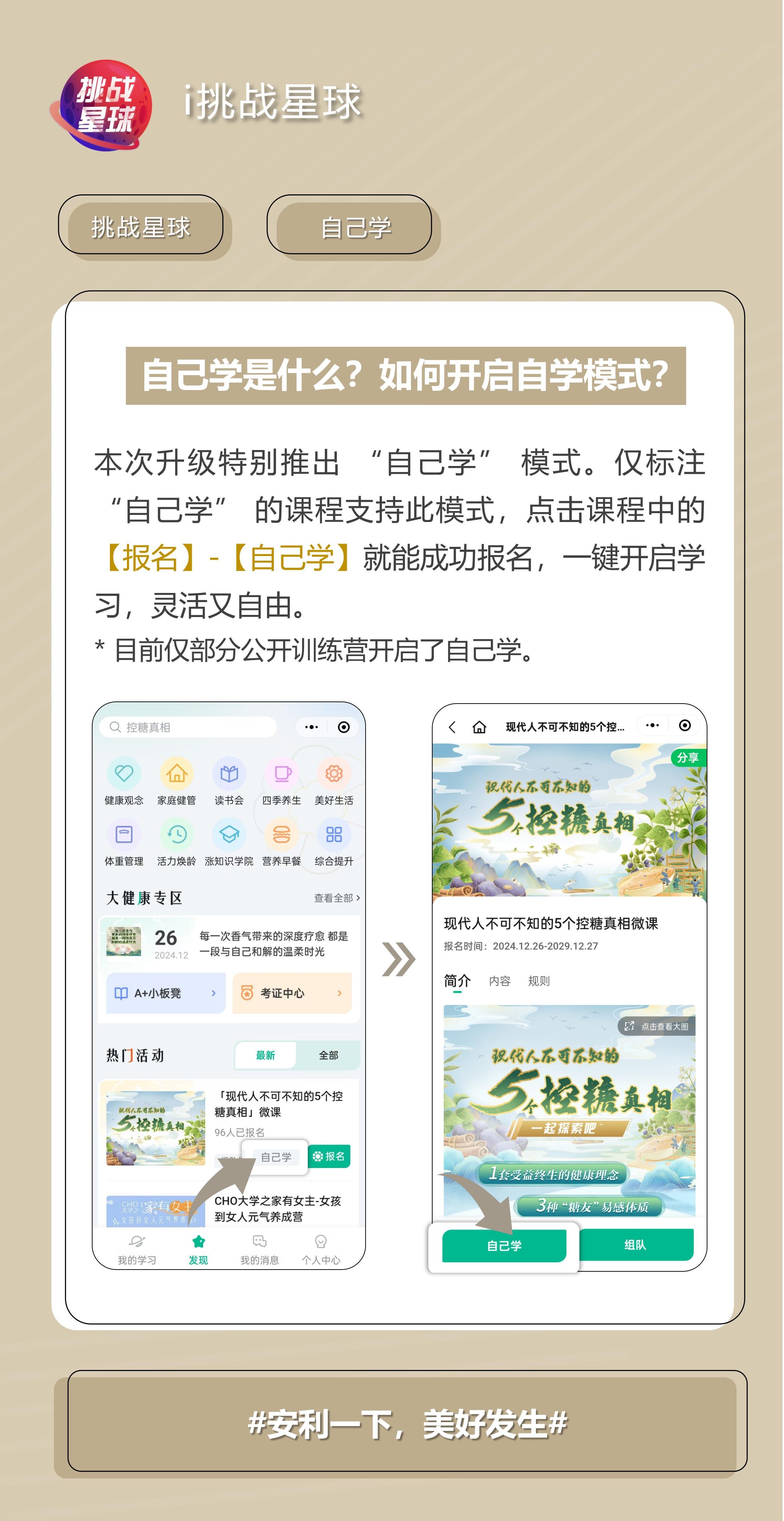 本次升级特别推出 “自己学” 模式。仅标注 “自己学” 的课程支持此模式, 点击课程中的 【报名】-【自己学】就能成功报名, 一键开启学习, 灵活又自由。