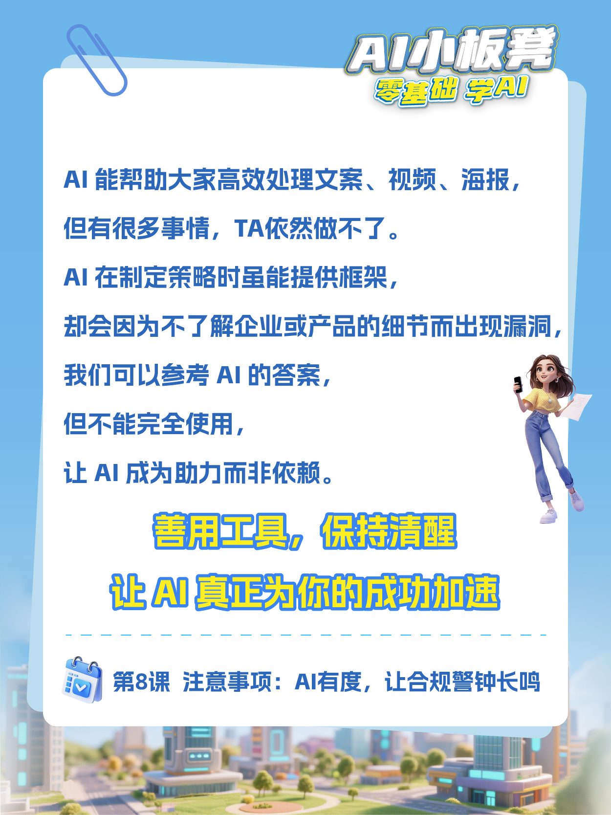 虽然智能时代AI能帮助大家高效的处理文案、视频、海报,但是AI依然有很多事情做不了。比如稍不留神就会说瞎话,对企业的产品及文化不能足够的了解。所以我们可以参考AI的答案,但不能完全使用AI的答案。