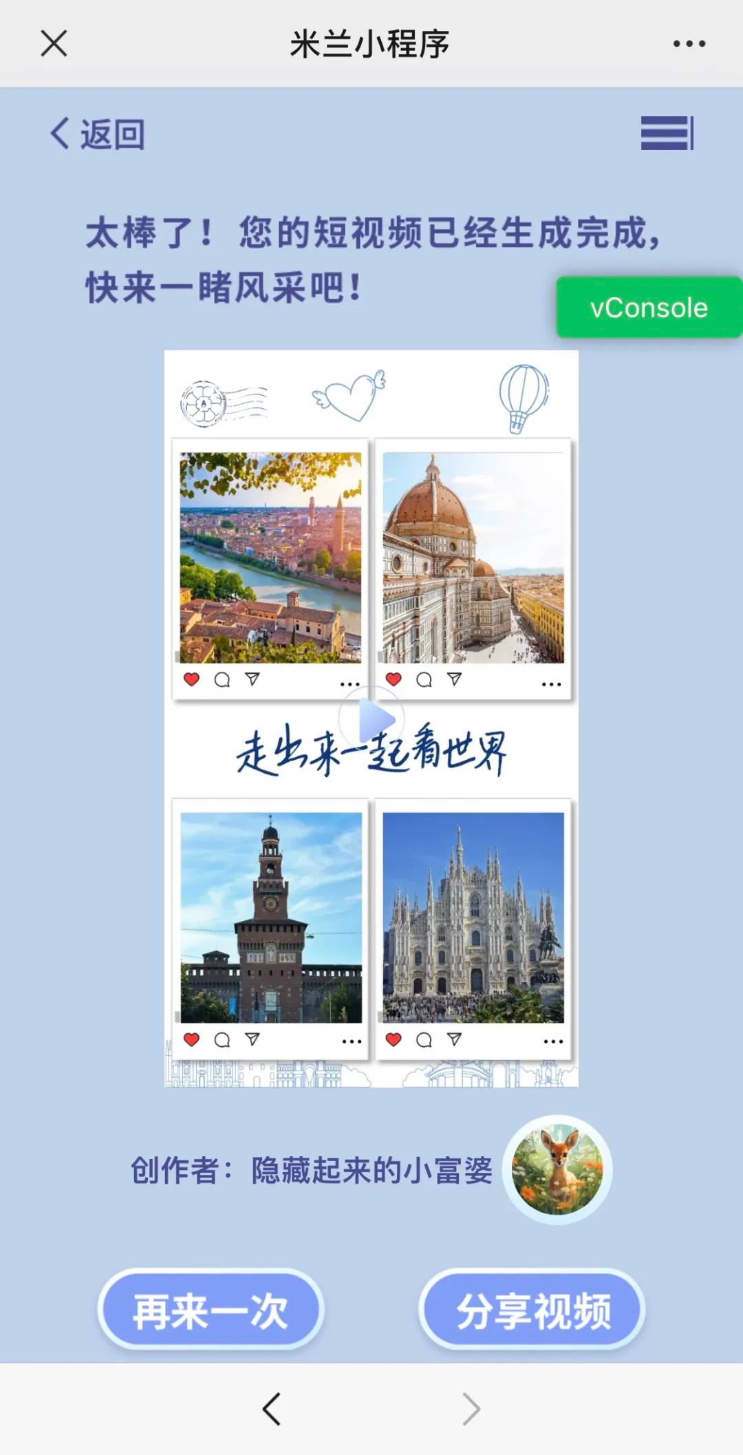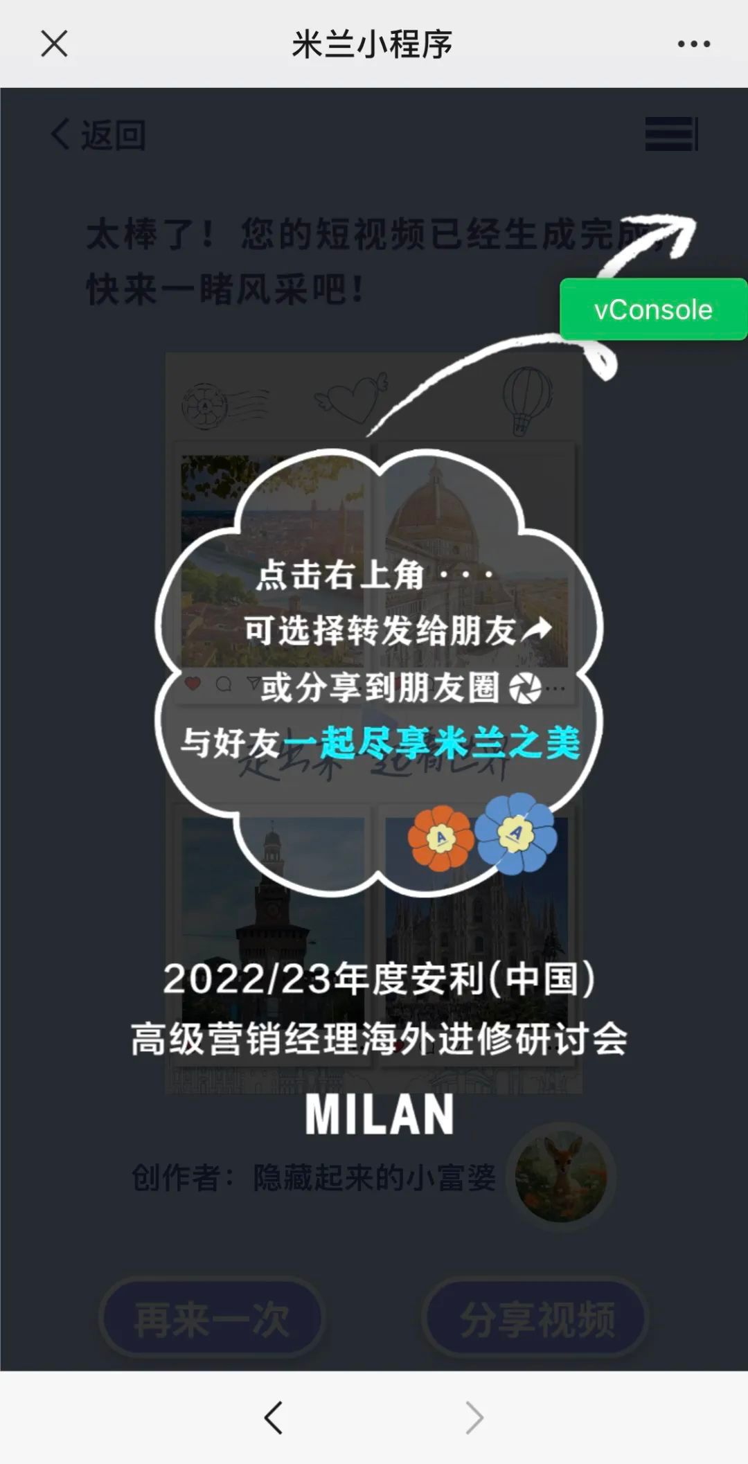 稍等片刻,视频就生成好,跳转到手机浏览页面中,即可转发和分享视频。