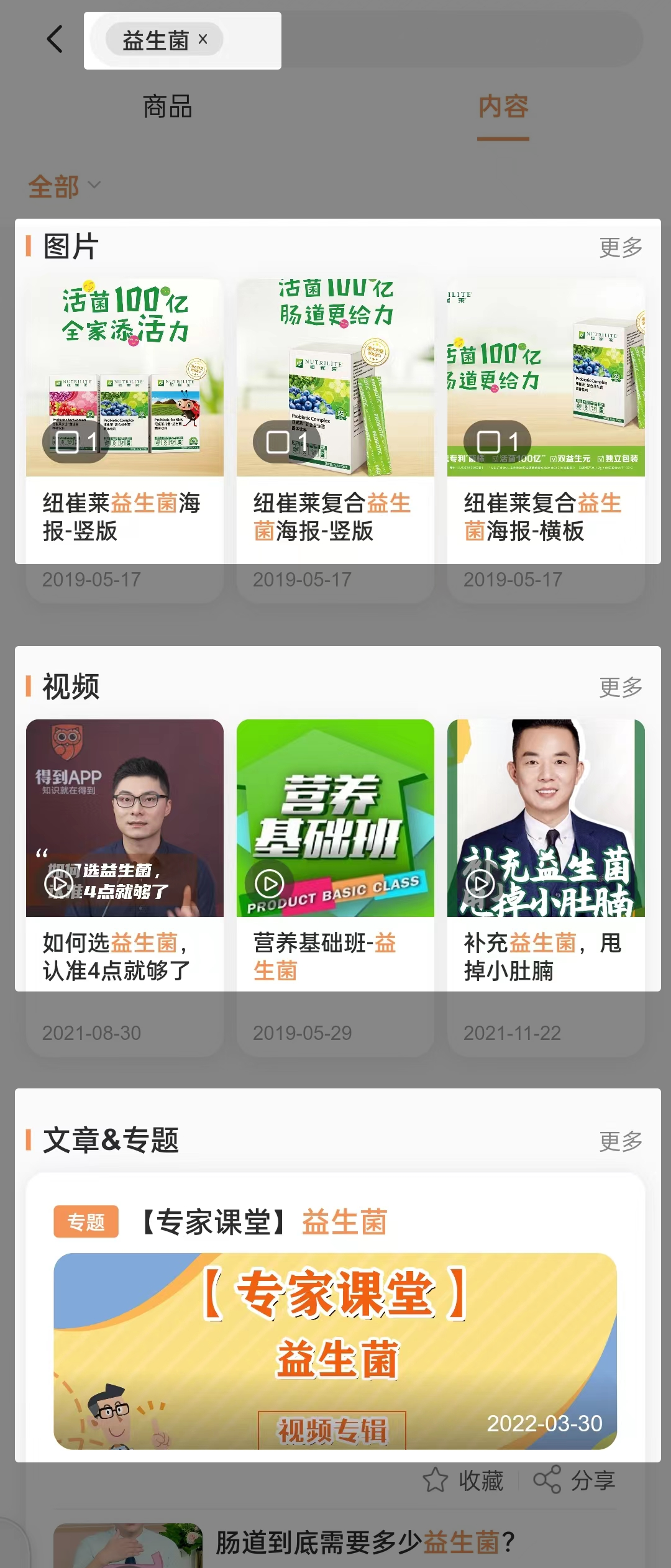 ↑↑例:当你想要查找益生菌相关内容,搜索关键字“益生菌”,便可以看到优质的图片、视频、文章/专题等各种物料内容,已经被集中优先展现。