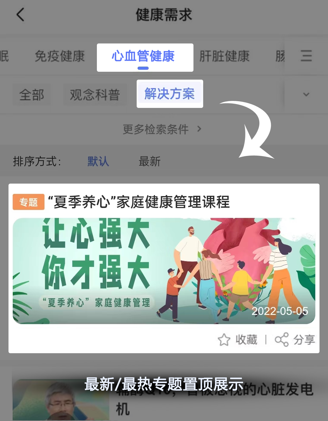 ↑↑例:依次点击【健康需求】-【心血管健康】-【解决方案】,即可在结果页顶部看到最新/最热的精编专题内容!