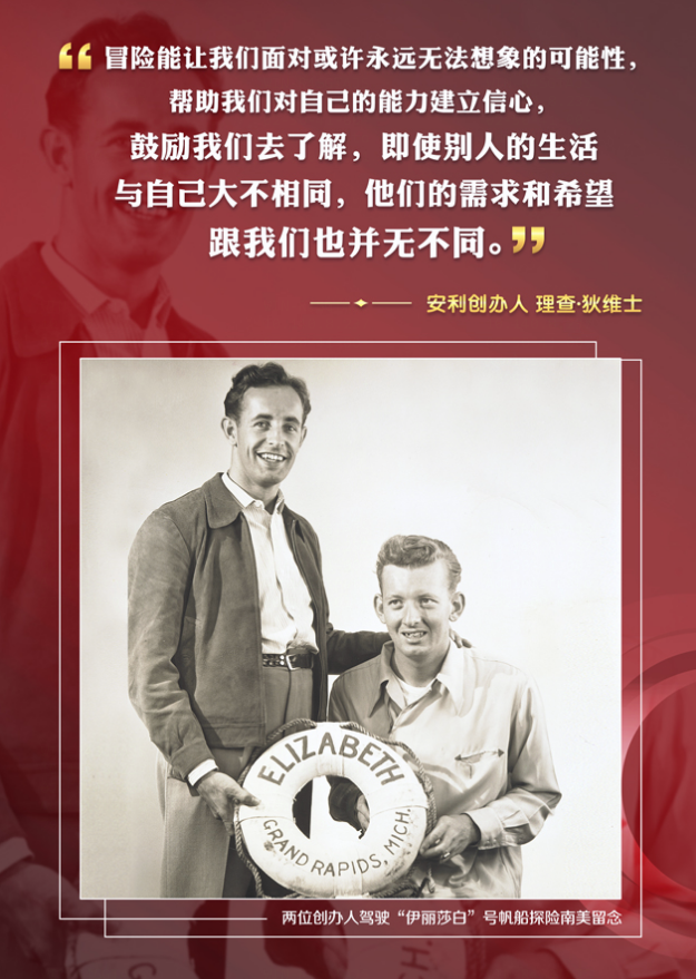 冒险精神是创业者的必备品质,通往财富和时间自由的道路上,更是少不了一次又一次的冒险。1949年时,安利的两位老创办人理查·狄维士和杰·温安洛开启了他们的“间隔年”。他们驾驶着长约11.6米的“伊丽莎白”号驶向加勒比海。这趟冒险之旅,即使对于经验丰富的船员来说,也不算一件容易事。而两位创办人,在买下“伊丽莎白”号之前,甚至连甲板都没上过。