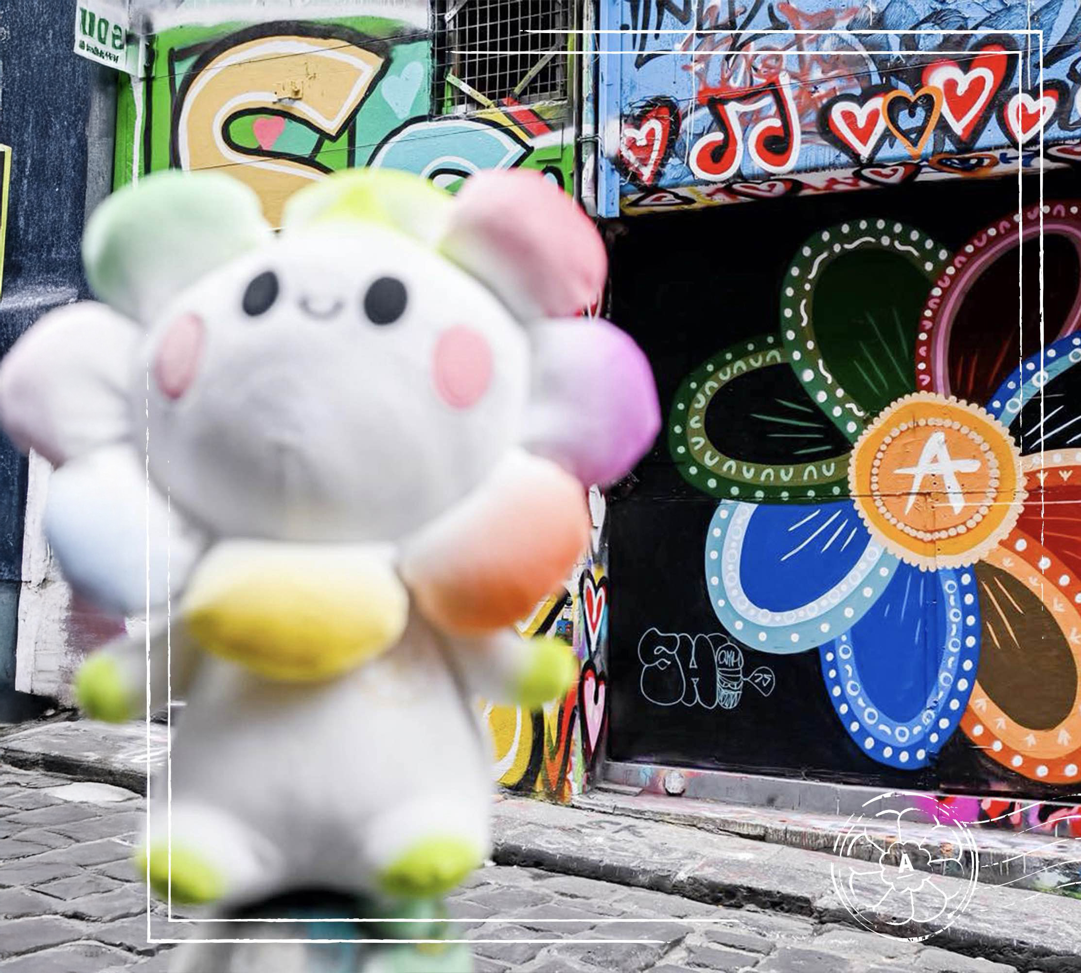 2025年4月,澳大利亚,墨尔本营销菁英海外进修研讨会。当地涂鸦艺术家融合原住民文化创作的独具特色的美花,与美花吉祥物“花仔”相映成趣。