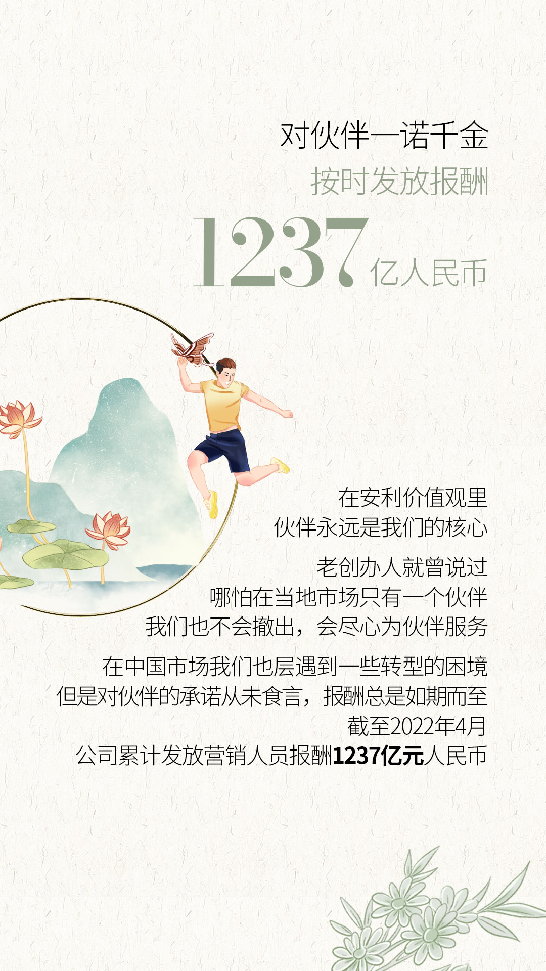 在安利价值观里,伙伴永远是我们的核心。老创办人就曾说过,哪怕在当地市场只有一个伙伴,我们也不会撤出,会尽心为伙伴服务。在中国市场我们也曾遇到一些转型的困境,但是对伙伴的承诺从未食言,报酬总是如期而至。截至2022年4月,公司累计发放营销人员报酬1237亿元人民币。