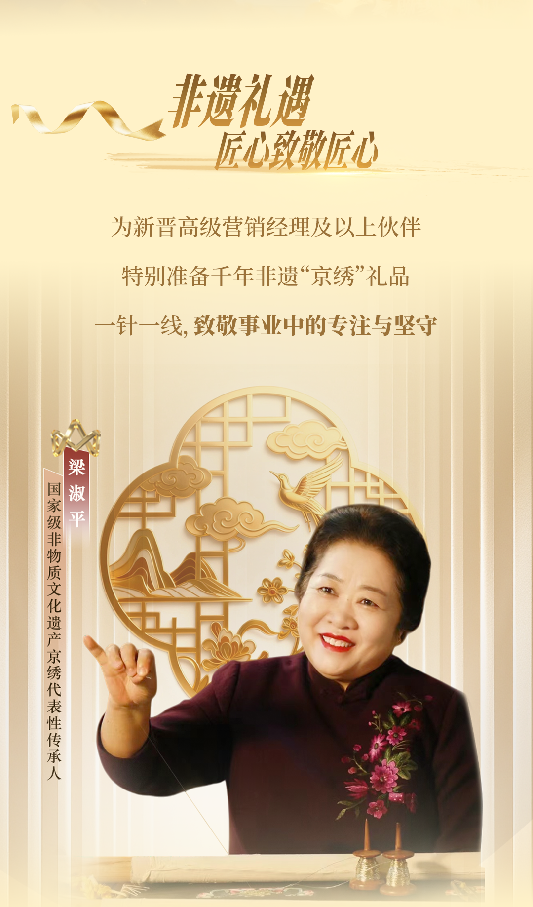 为新晋高级营销经理及以上伙伴特别准备千年非遗“京绣”礼品一针一线,致敬事业中的专注与坚守