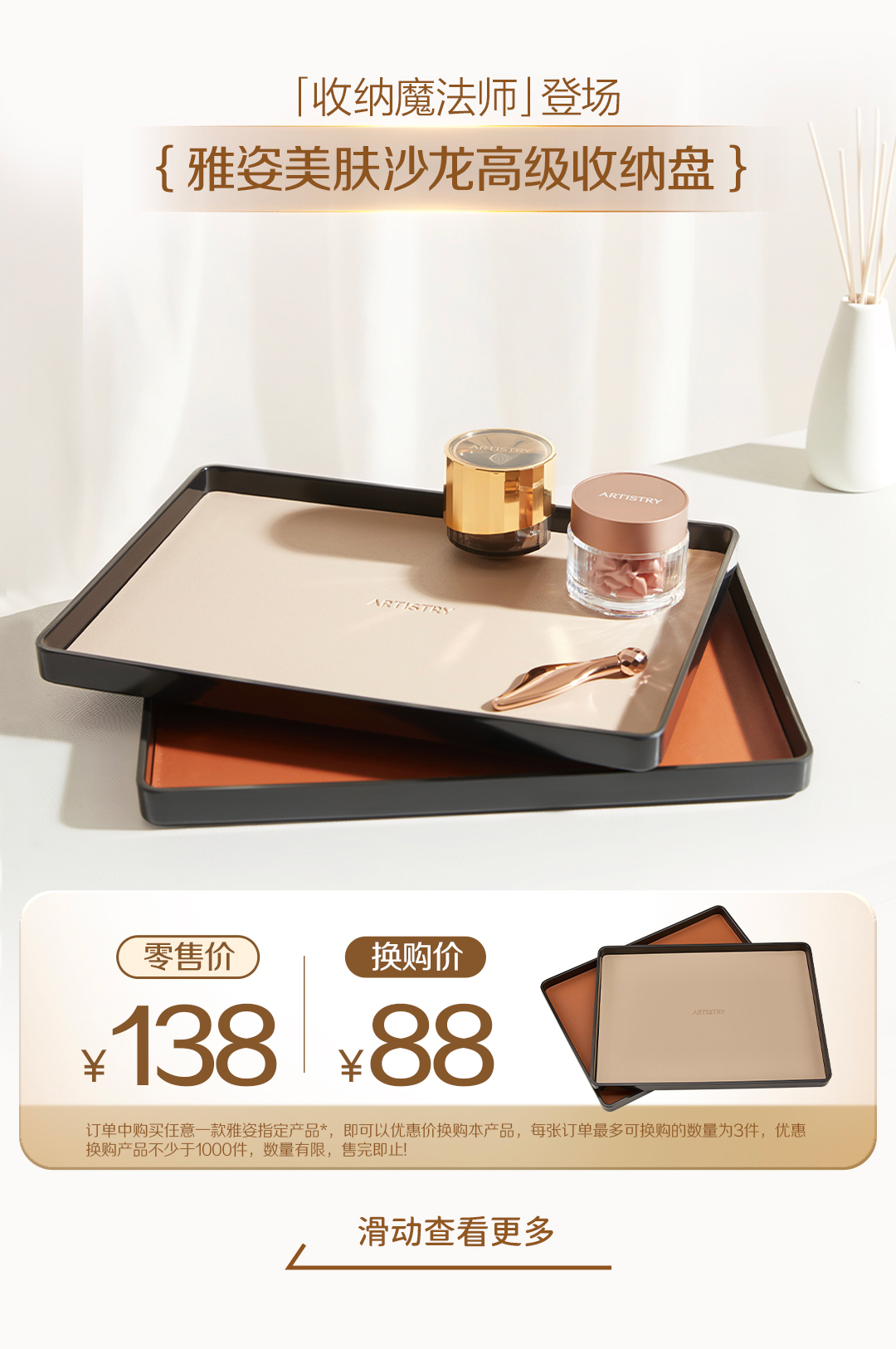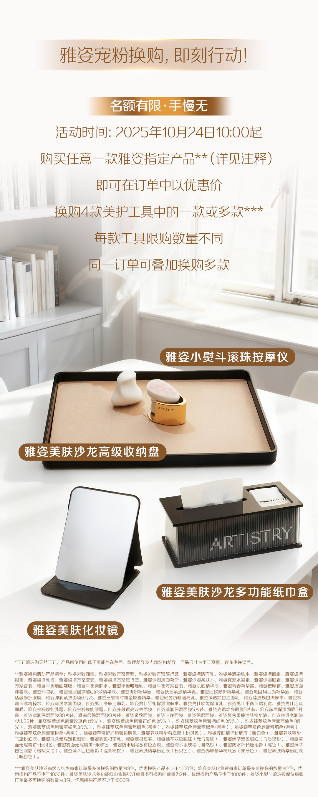 **雅姿美肤沙龙高级收纳盘每张订单最多可换购的数量为3件,优惠换购产品不少于1000件;雅姿美肤化妆镜每张订单最多可换购的数量为2件,t