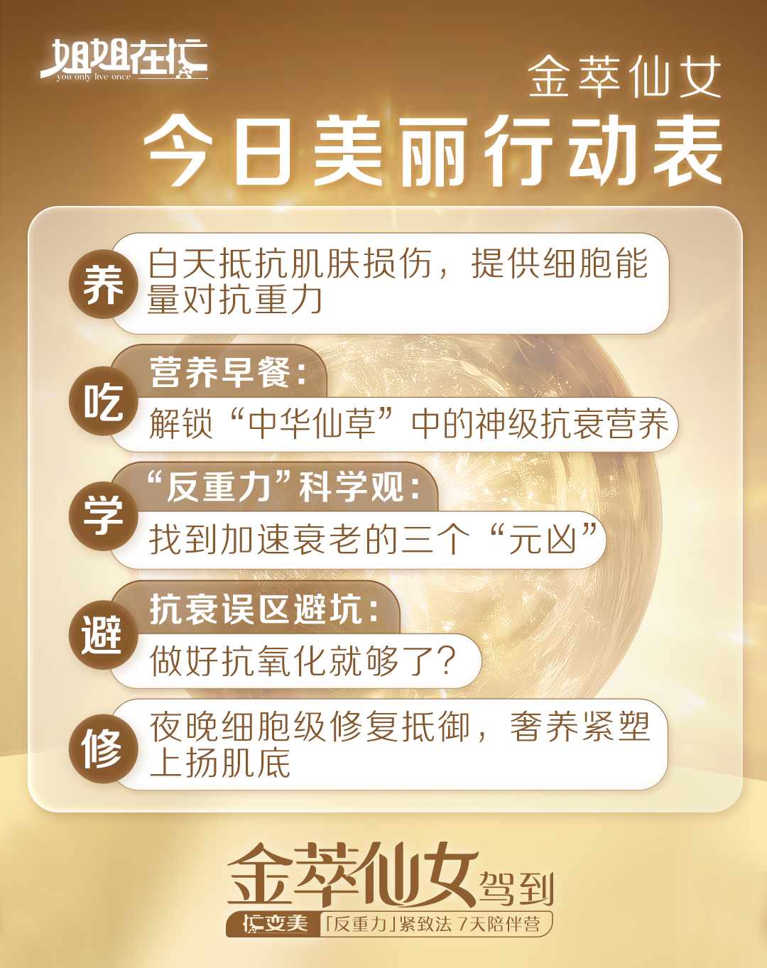 姐妹们,让我们带着"逆生长"的期许,开启今日份「反重力」美丽修行吧,一起看看今日美丽行动表!